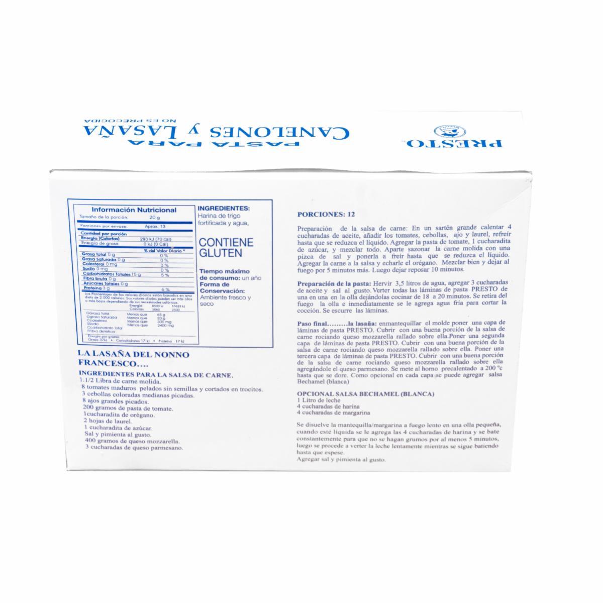Pasta Para Lasaña Y Canelones No Precocida PRESTO 250 G