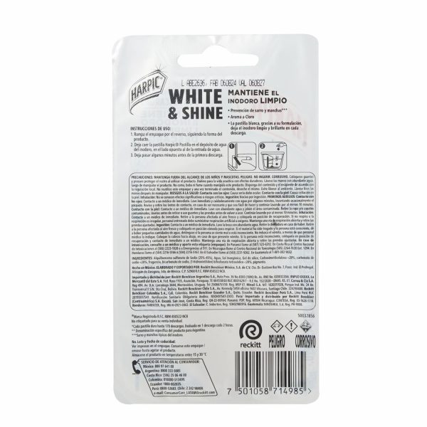 Harpic Pastillas White And Shine Con Aroma A Cloro Y Con Bicarbonato Es Un Limpiador Para Inodoros Que Tiene Más Poder De Desinfección Y Dura Hasta 4 Semanas. Gracias A Su Formulación, Deja El Inodoro Limpio Y Brillante En Cada Descarga. Lea Atentamente La Etiqueta Del Producto Antes De Su Uso