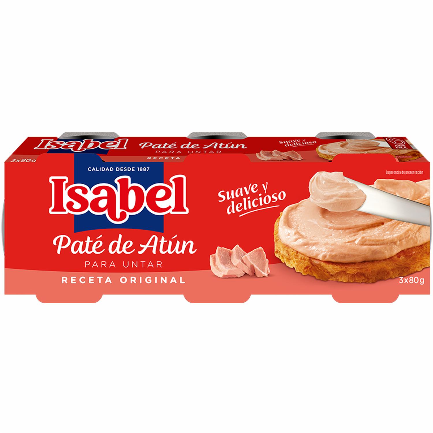 - El Paté de Atún ISABEL 3 x 80 g es una opción deliciosa y práctica para disfrutar de un snack o acompañar tus platos favoritos. Con una suave textura y el sabor inconfundible del atún, este paté es ideal para untar en pan, crackers o como relleno en sándwiches
