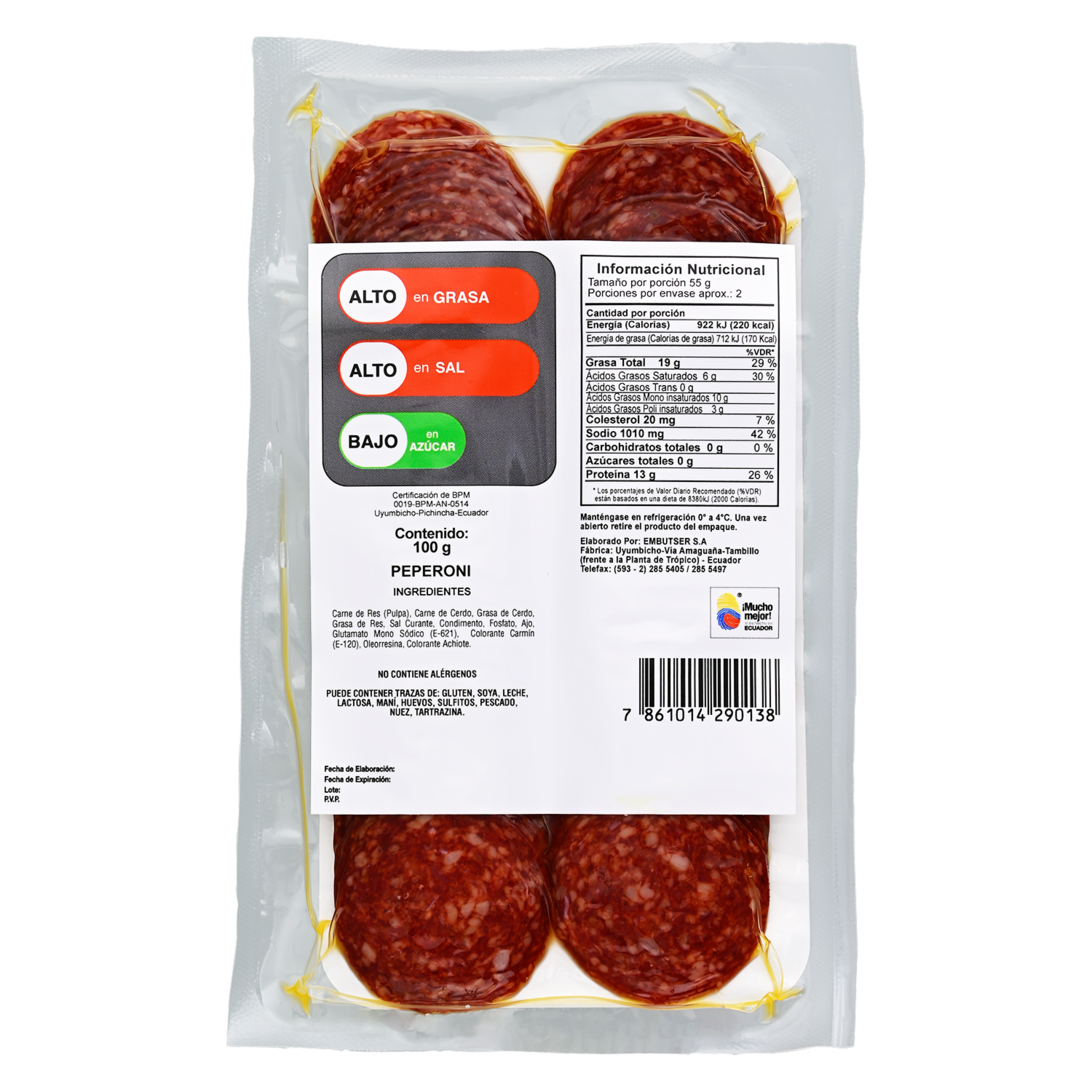 Producto preparado de seleccionada carne de res, con el condimento pepperoni, para lograr un sabor algo picante y dulce y su característico color rojizo intenso