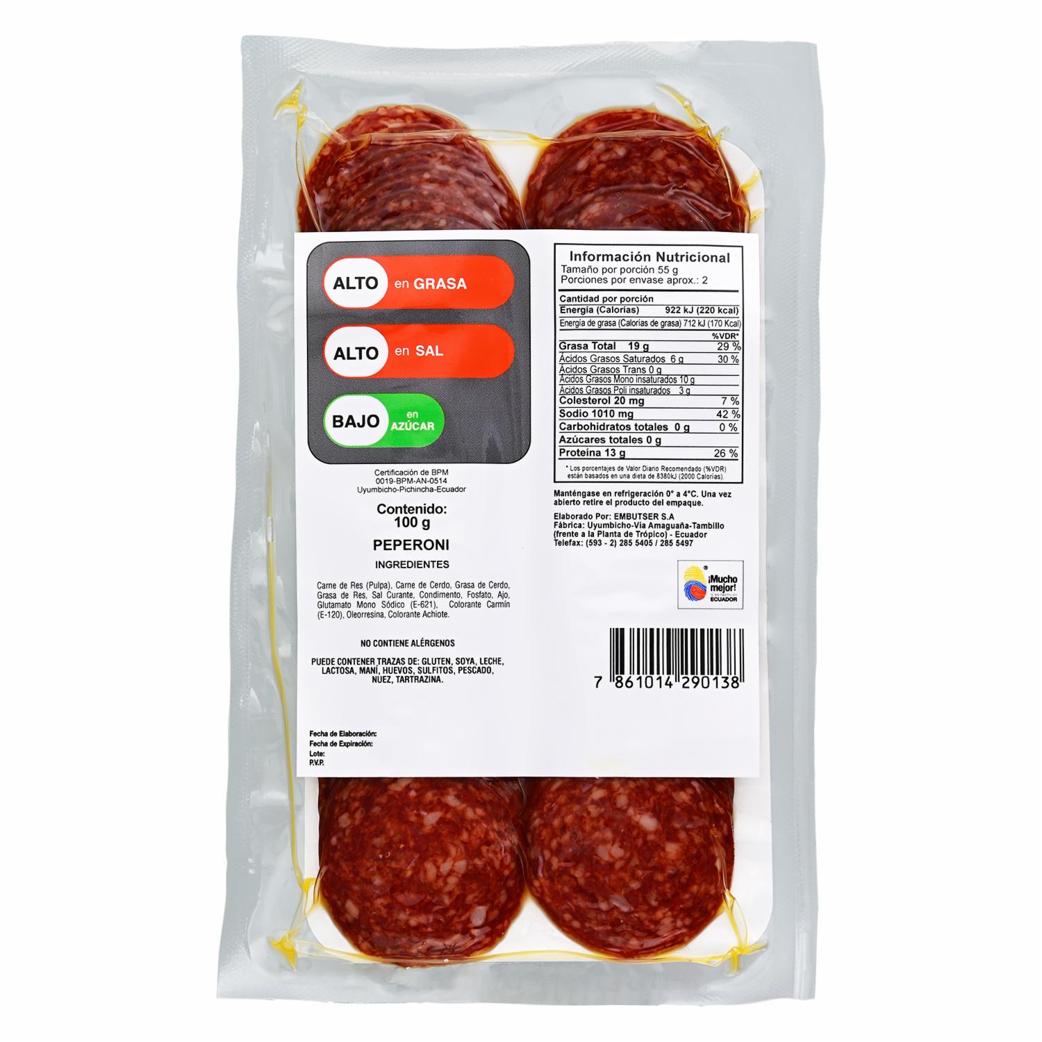 Producto preparado de seleccionada carne de res, con el condimento pepperoni, para lograr un sabor algo picante y dulce y su característico color rojizo intenso