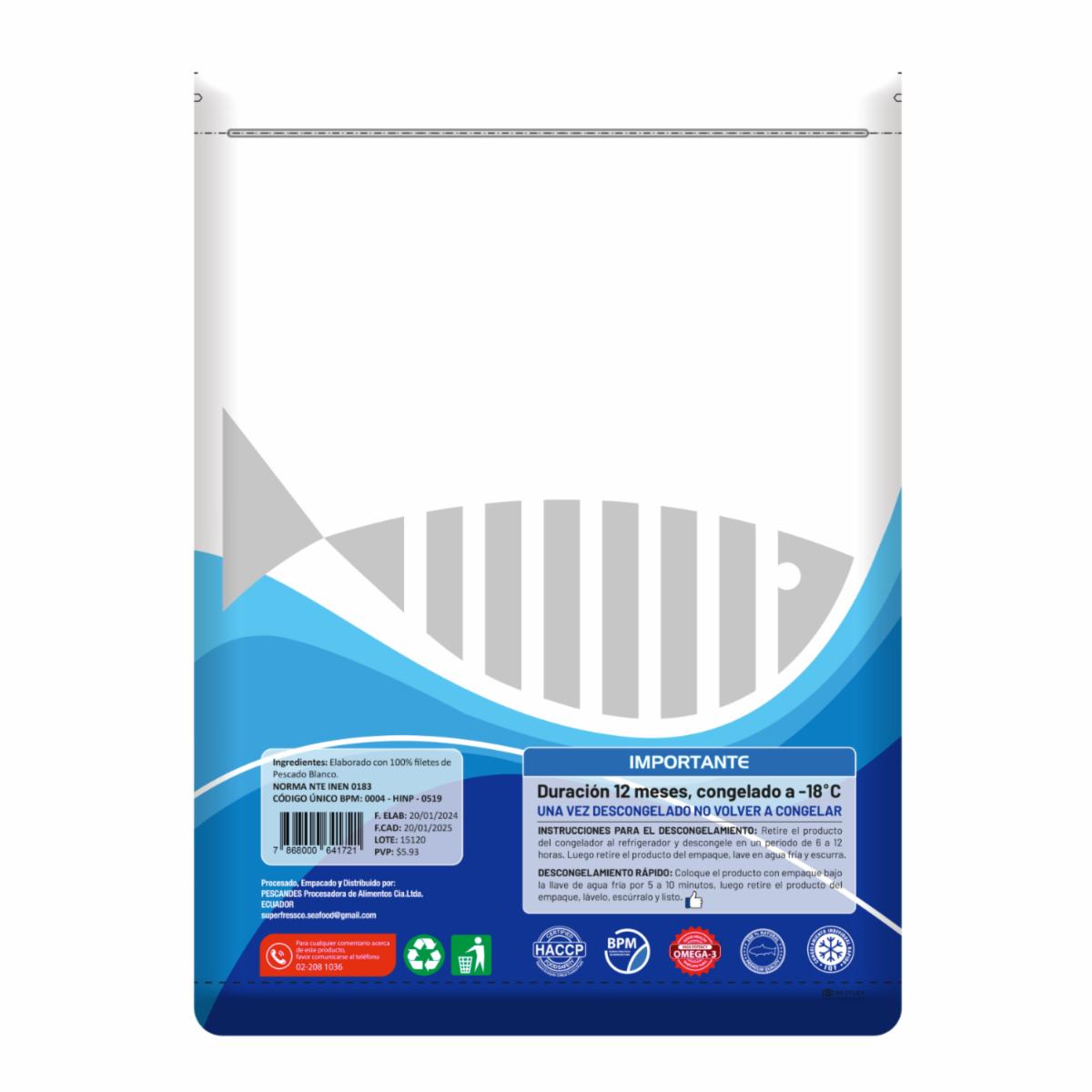 Contiene de 5 a 10 sticks de pescado blanco sin piel, espinas y congelados IQF. Listos para cocinar y servir