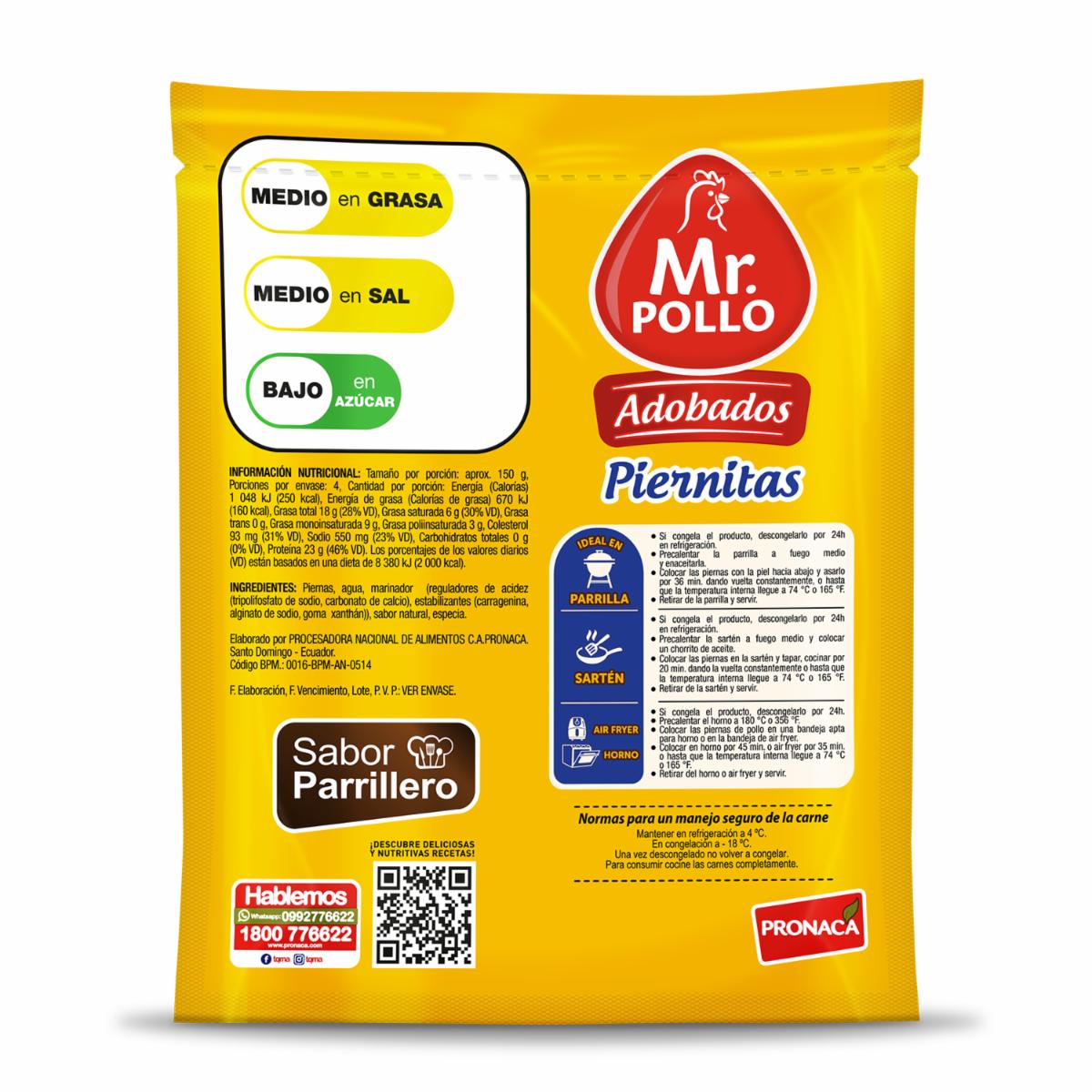 Empacado en funda individual con marca Mr Pollo. La funda es sellada al vacío. Peso de 0,460-0,700 kg