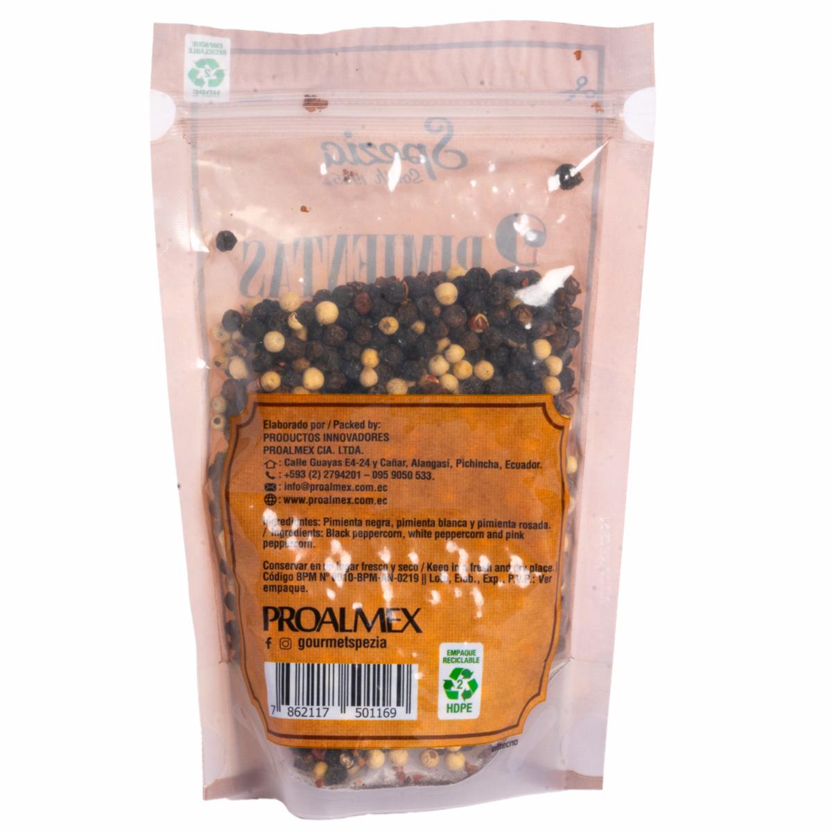 - Tres tipos de pimientas, una exquisita mezcla de pimienta negra, blanca y rosada que le darán un sabor y aroma único a tus comidas