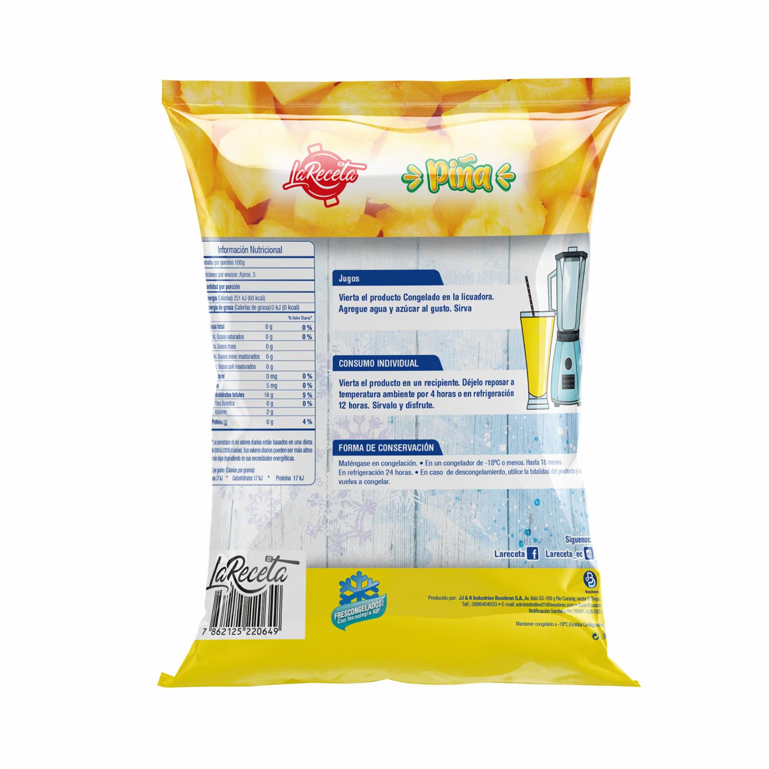 La Piña Congelada LA RECETA en presentación de 500 g es una opción fresca y deliciosa para disfrutar de piña en cualquier momento del año,Esta piña ha sido cuidadosamente seleccionada y congelada para mantener su frescura, sabor y nutrientes,La presentación de 500 g te permite tener suficiente piña congelada en tu congelador para utilizarla en diversas preparaciones culinarias