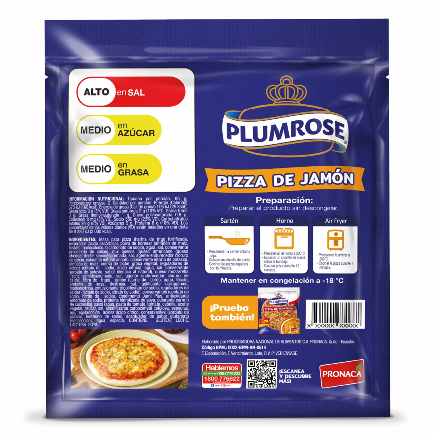 Pizza Jamón PLUMROSE 130 G – PLUMROSE. Disponible en nuestros locales. Precio y stock pueden variar según la tienda.