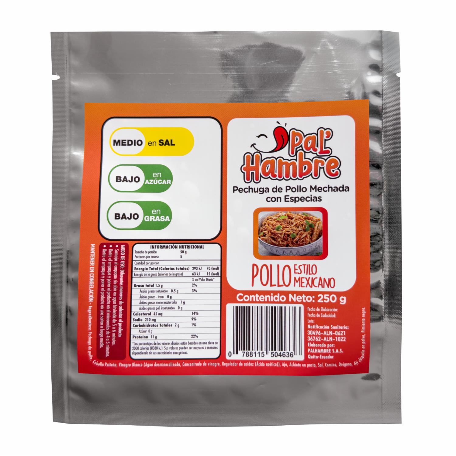 - Pollo estilo mexicano PALHAMBRE es exclusivamente carne de pechuga de calidad suprema, cocinada con especias en sus propios jugos, mechada, lista para servir. Sin colorantes, preservantes , saborizantes ni grasa añadida