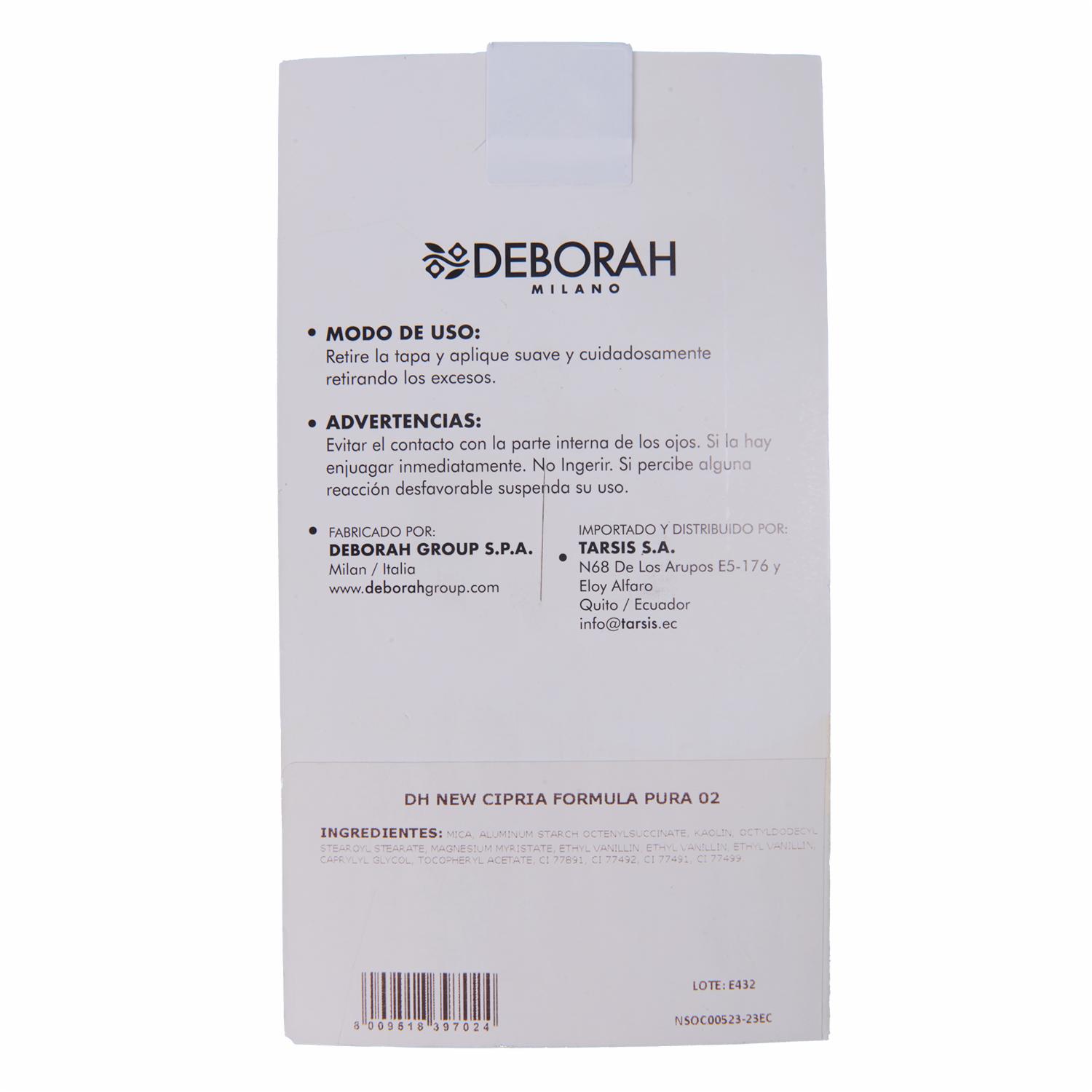 • El polvo compacto Fórmula Pura Cipria 02 de la marca Deborah tiene las siguientes características y usos: Características: - Es un polvo compacto de textura suave y ligera. - Contiene ingredientes naturales y minerales. - No contiene parabenos, siliconas, aceites ni fragancias. - Proporciona un acabado mate y natural. - Es resistente al agua y al sudor