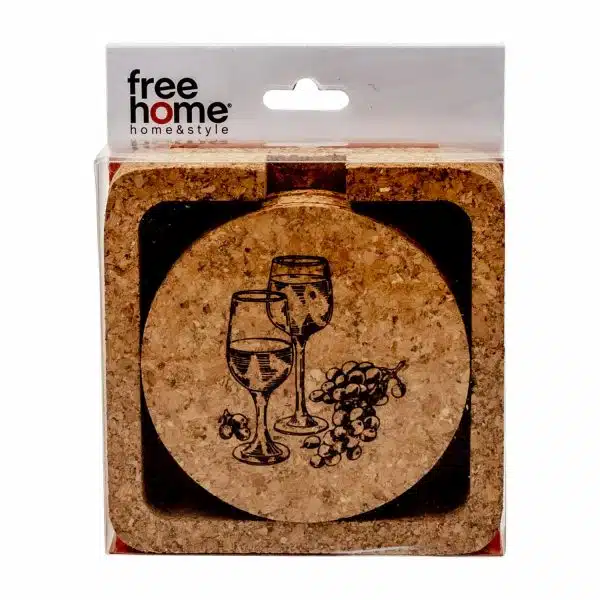 • Los "Portavasos de Corcho Redondo FREE HOME 4 Uds" son un conjunto de cuatro posavasos redondos fabricados con corcho