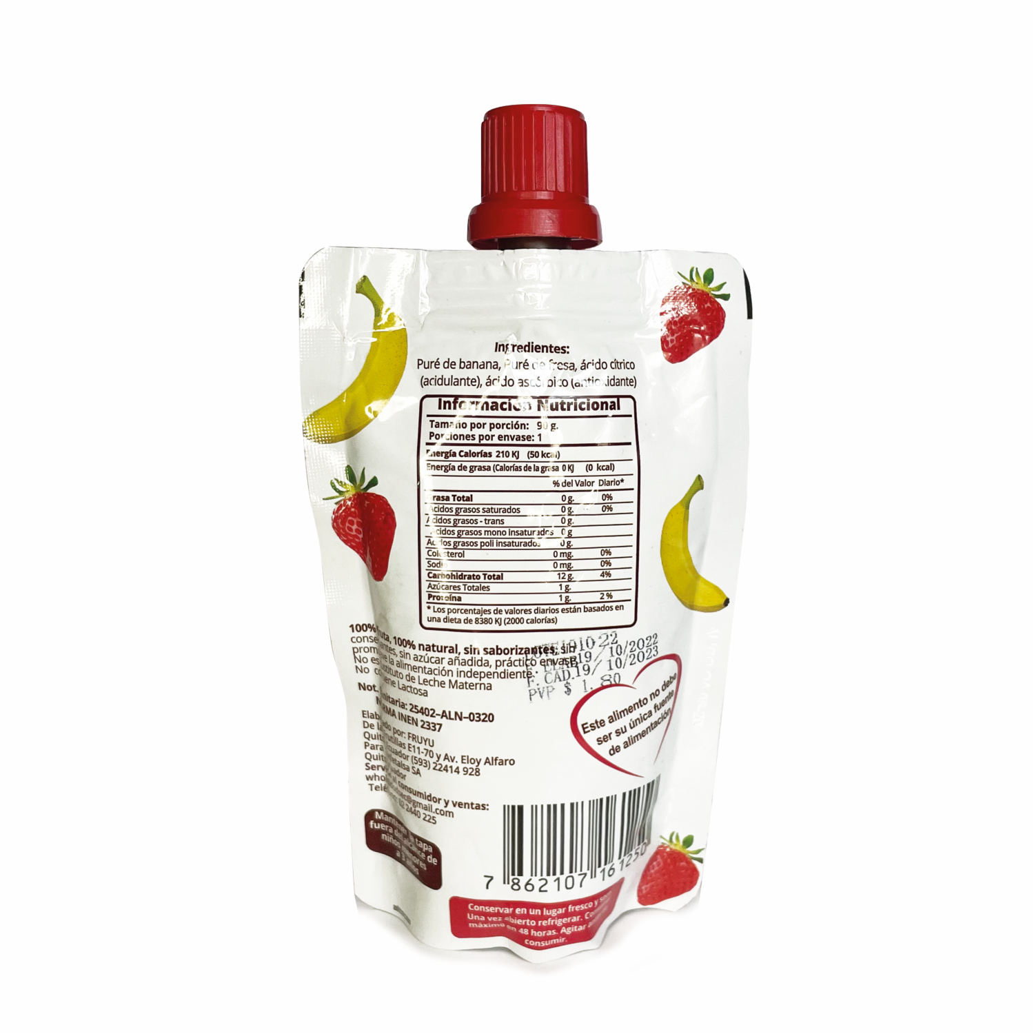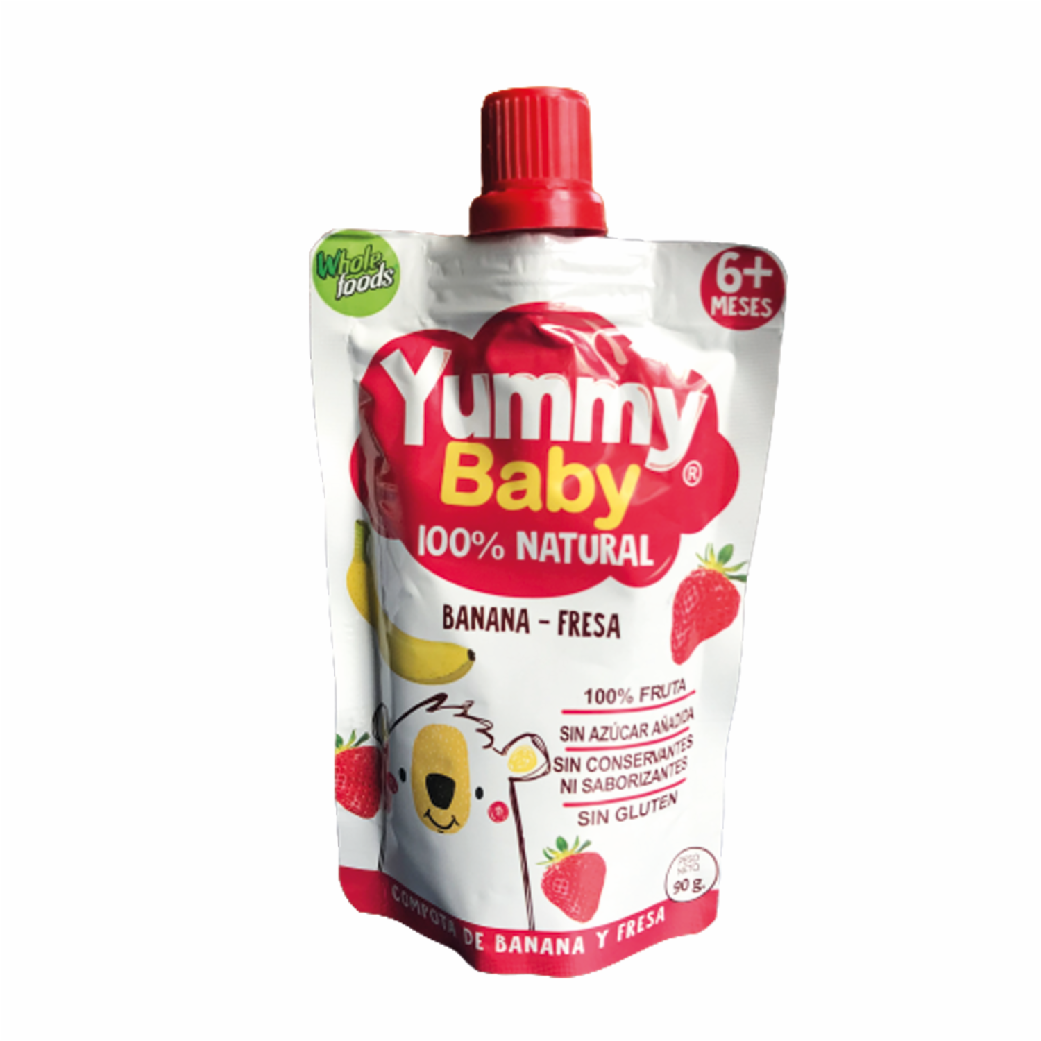 - El Pouch de Frutas Banana y Fresa Yummy Baby, en su presentación de 90 g, es un producto diseñado especialmente para bebés y niños pequeños. Estas bolsitas de compota son una opción conveniente y práctica para proporcionar una merienda o complemento alimenticio nutritivo para los más pequeños