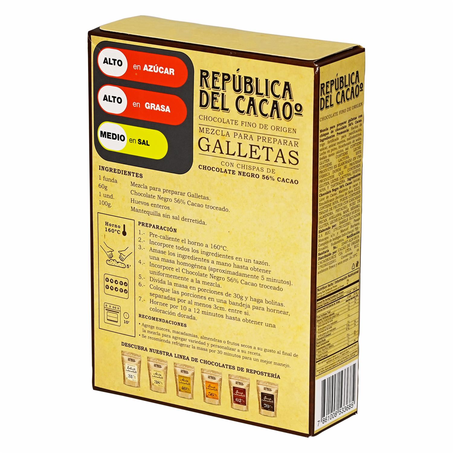 - Nuestra premezcla está especialmente diseñada para facilitar la preparación de deliciosas galletas con chispas de chocolate en la comodidad de tu hogar. Simplemente mezcla la premezcla con ingredientes básicos como huevos y mantequilla, agrega las chispas de chocolate incluidas, y hornea para obtener galletas irresistibles
