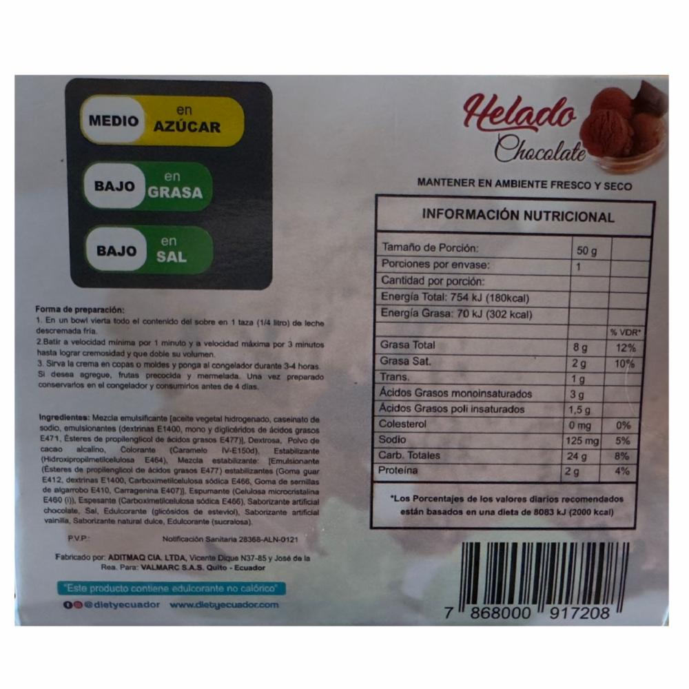 Premezcla Para Helado Sabor Chocolate Mezcla En Polvo Sin Azúcar DIETY 6 Porciones