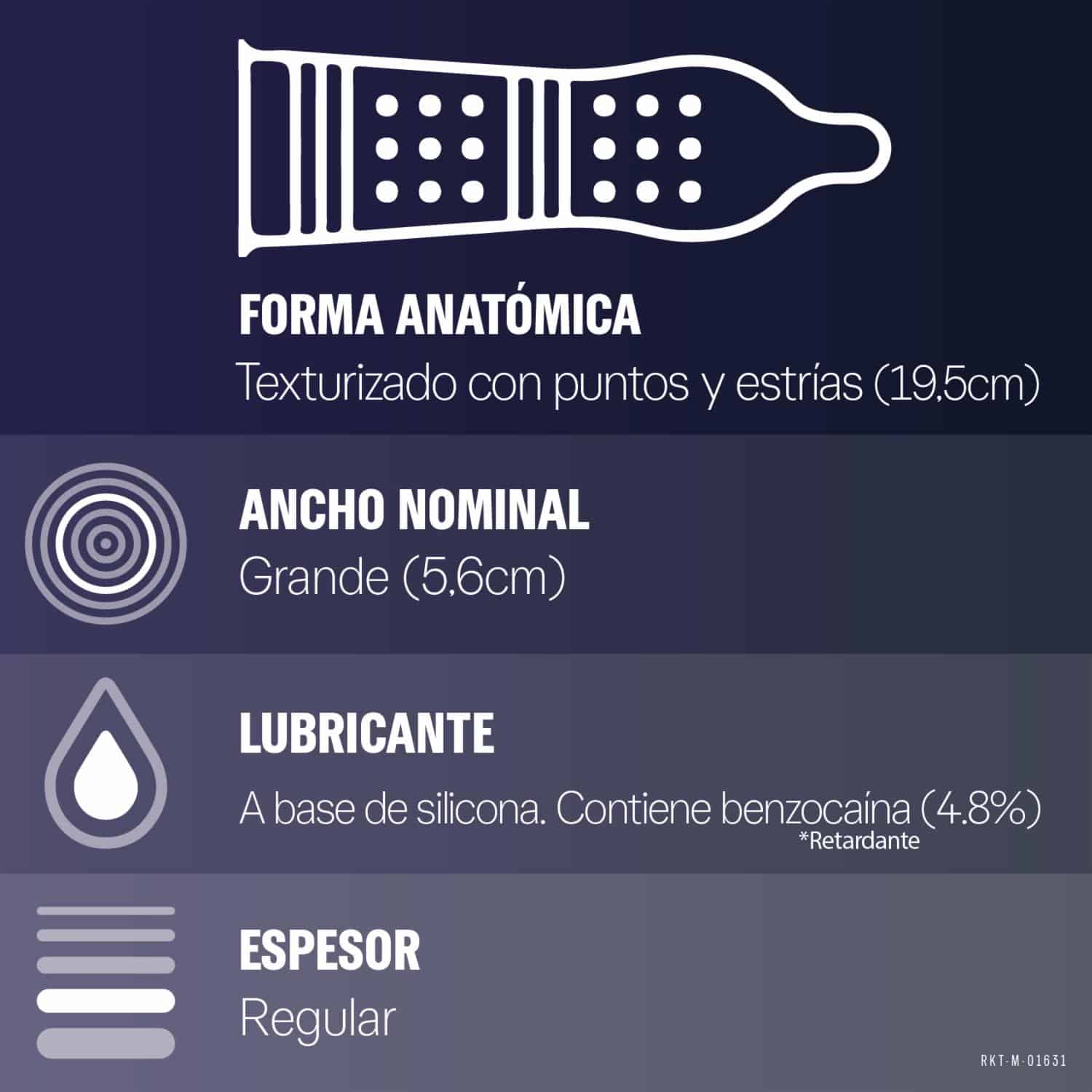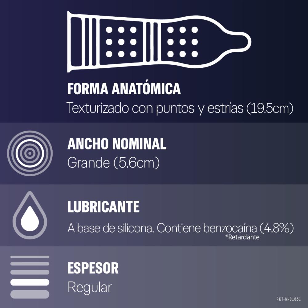 • Estos conservantes son únicos por su diseño de doble textura: por un lado, tienen puntos y estrías para intensificar la sensación de la pareja, y por el otro, contienen un lubricante retardante que prolonga la duración de la relación sexual para un mayor disfrute
