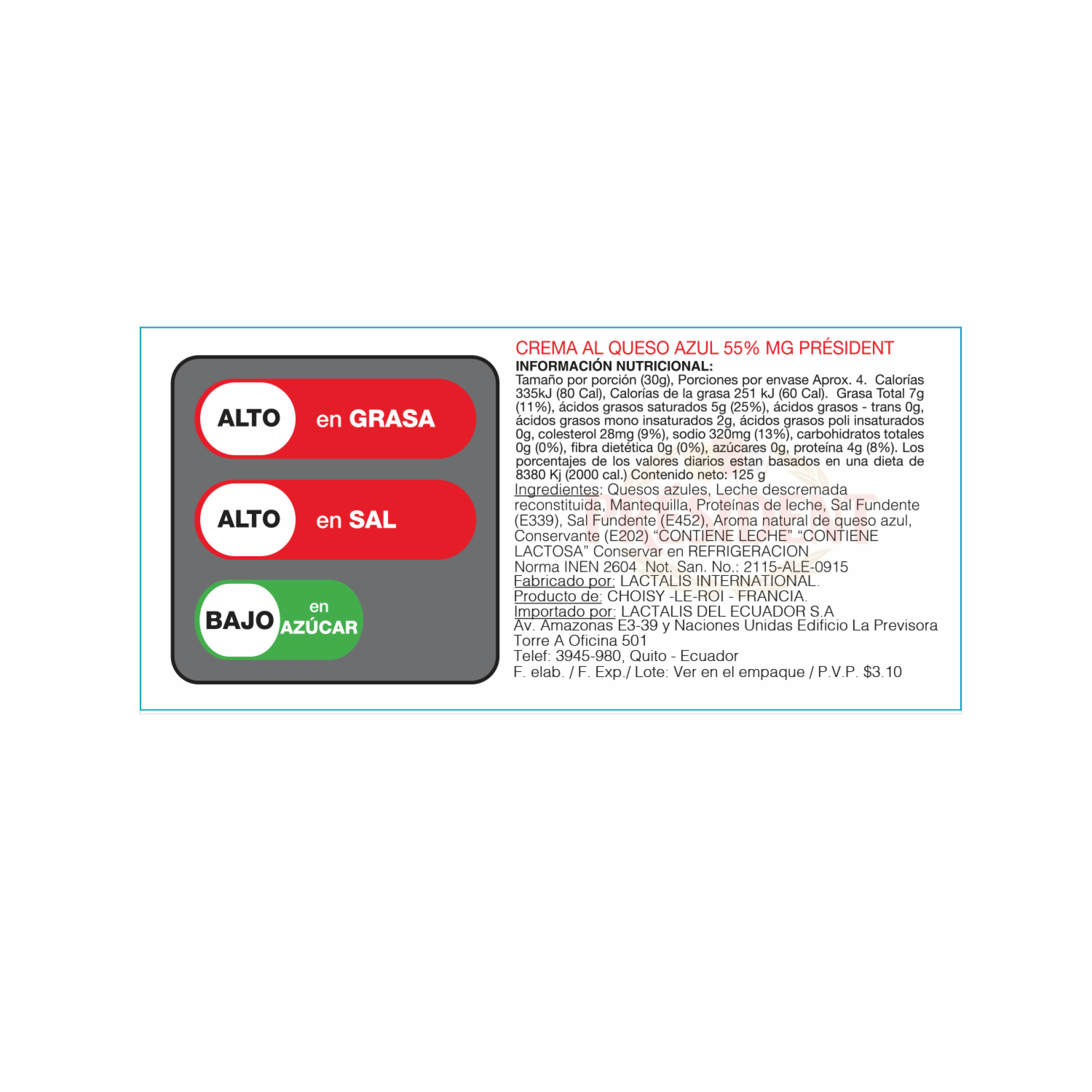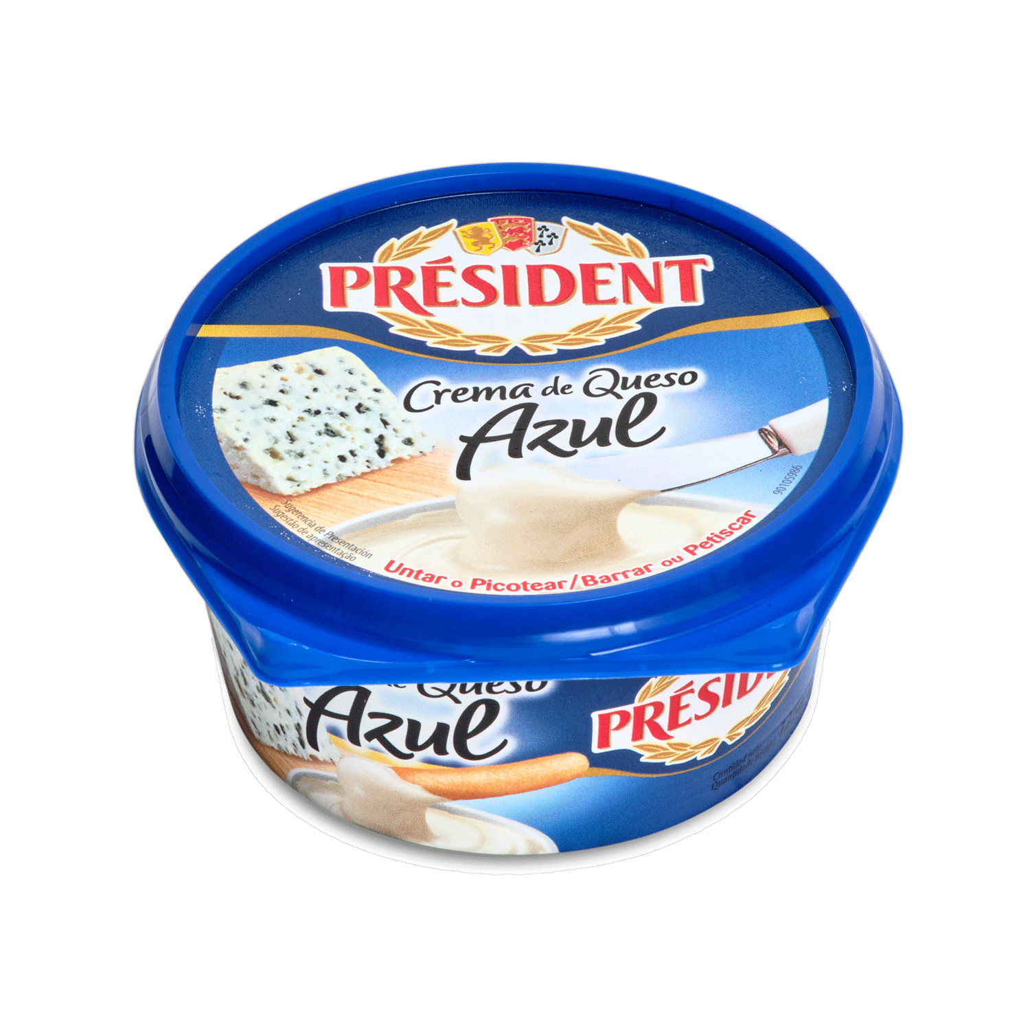 - - Es un queso crema suave y cremoso con sabor a queso azul., - Viene en un empaque práctico y fácil de usar., - Es ideal para untar en panes, galletas o como aderezo para ensaladas., - Puede ser utilizado en la preparación de salsas y dips., - Es un producto de alta calidad de la reconocida marca President