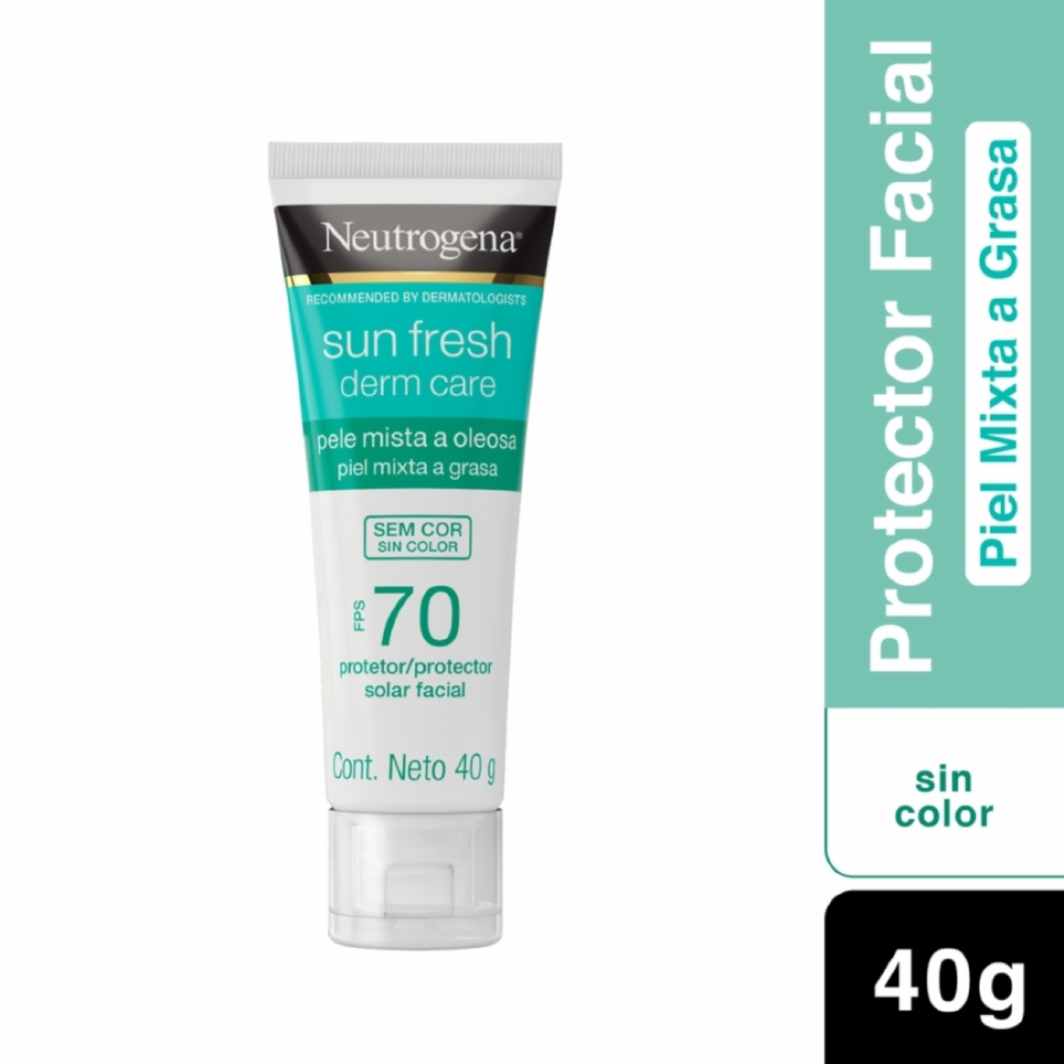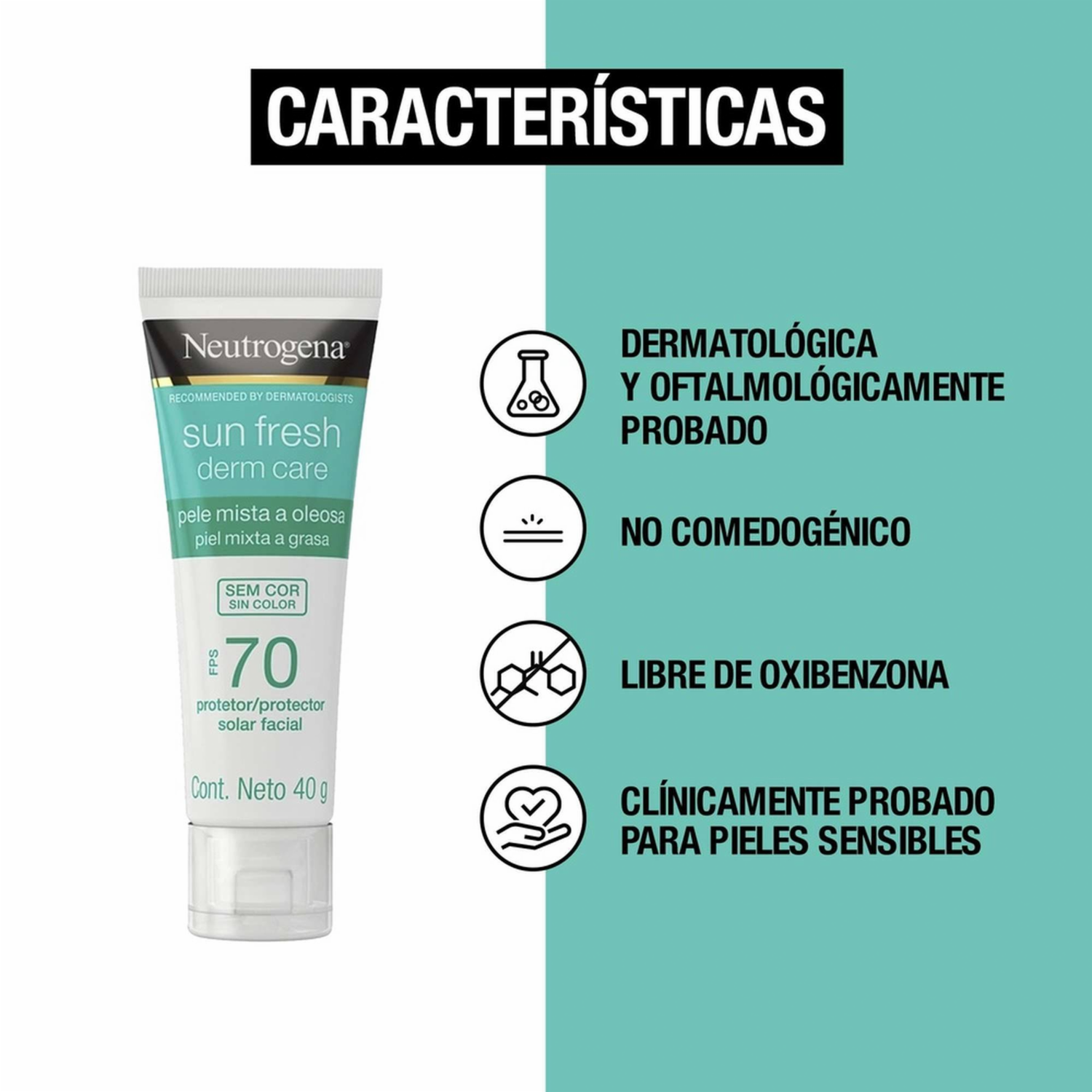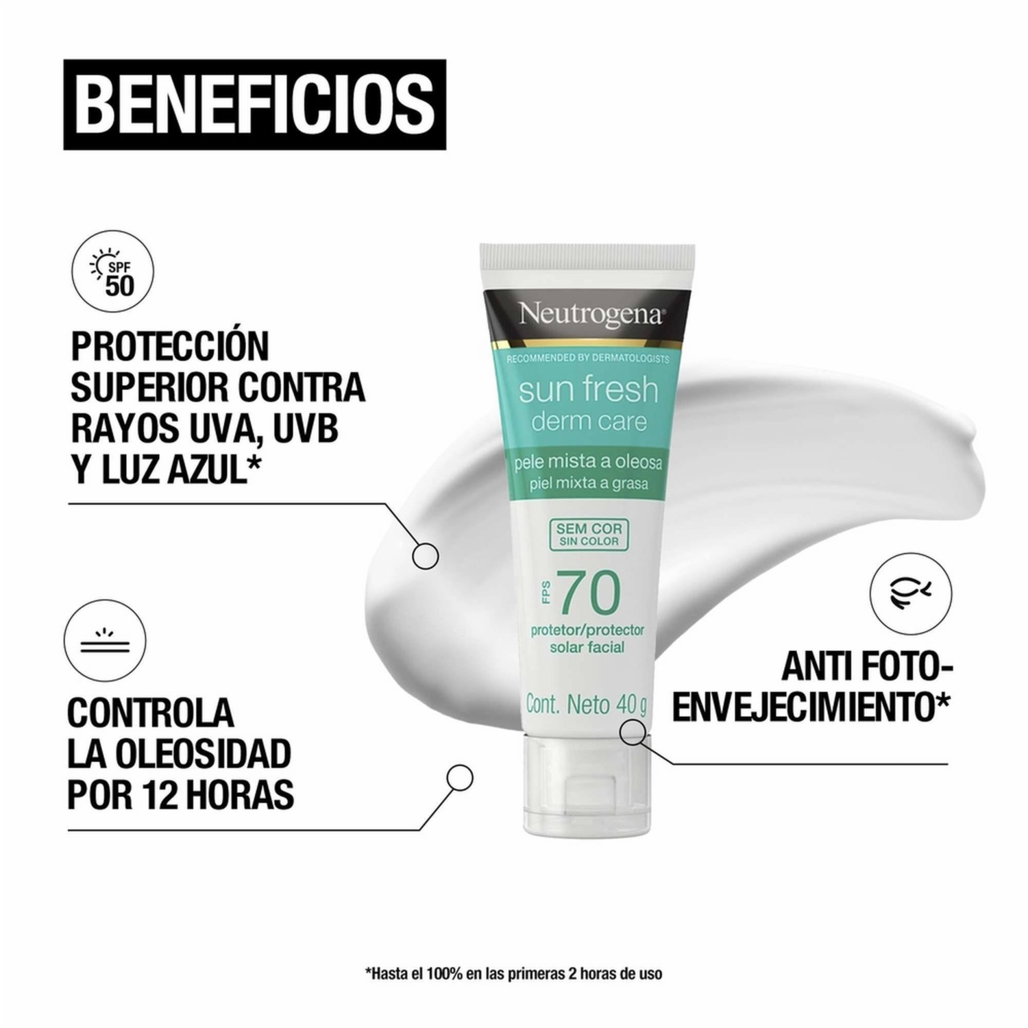 - Sun Fresh Derm Care tiene la ciencia dermatológica más avanzada de Neutrogena® para tu protección facial diaria brindando protección de amplio espectro superior, controla la oleosidad hasta por 12 horas y formulado para prevenir el daño solar
