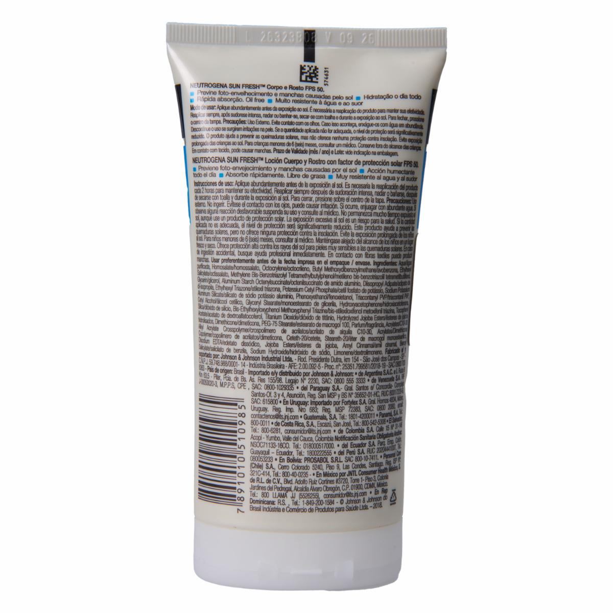 - Protector solar NEUTROGENA SUN FRESH Crema FPS 50 con amplia protección contra los rayos UVA/UVB por su exclusiva tecnología Helioplex. Su fórmula oil free se absorbe rápidamente, dejando la piel protegida, hidratada y seca al tacto. Resistente al agua y el sudor
