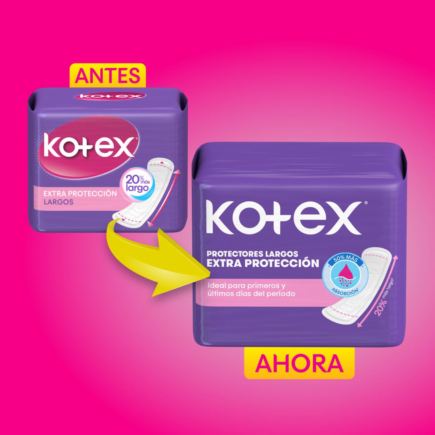 - Protector Diario Kotex ® Extra Protección. Gel absorbente: cuenta con un núcleo que brinda una absorción mejorada ( vs Prot Regular). Extra protección: 20% mas largo* (vs PD Cuidado Diario) que asegura una mayor área de adhesión a la ropa interior y por lo tanto también una mayor área de protección. Perfecto para los días de poco flujo menstrual