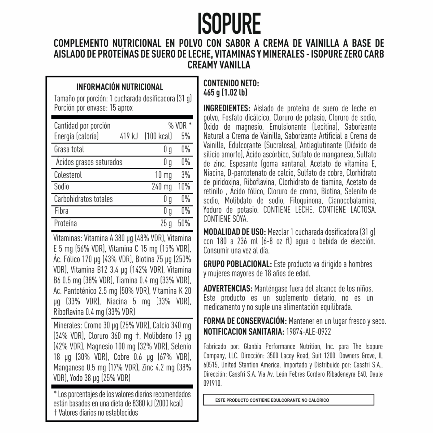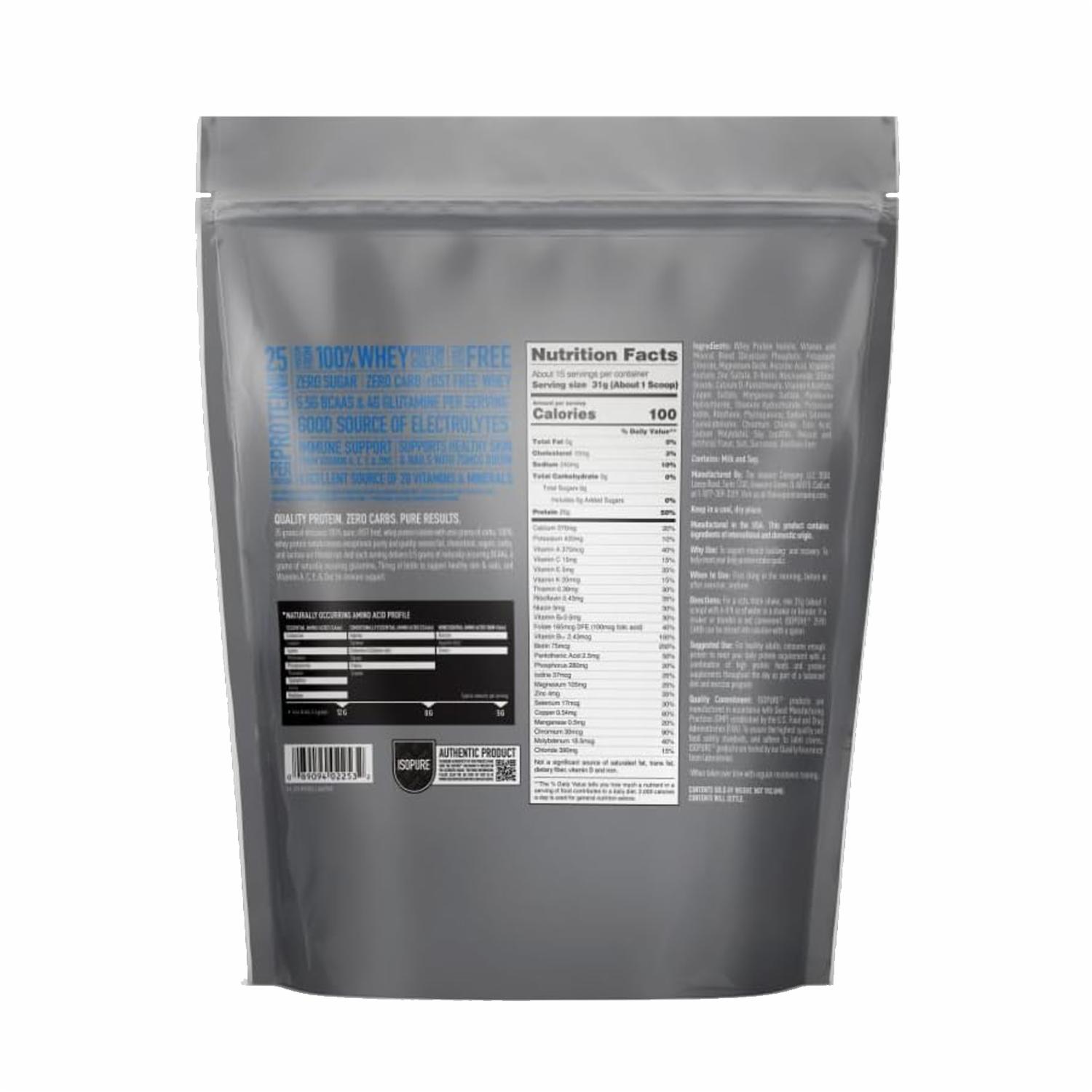 Isopure es una proteína de suero de leche aislado y deslactosado que no contiene azúcar, ni grasas, ni carbohidratos. Esto la convierte en una proteína extra pura que cuenta con 25 gramos de proteína, BCAAs y Glutamina. Contiene vitaminas y minerales No contiene Carbohidratos, Ni gluten Favorece el incremento de masa muscular magra