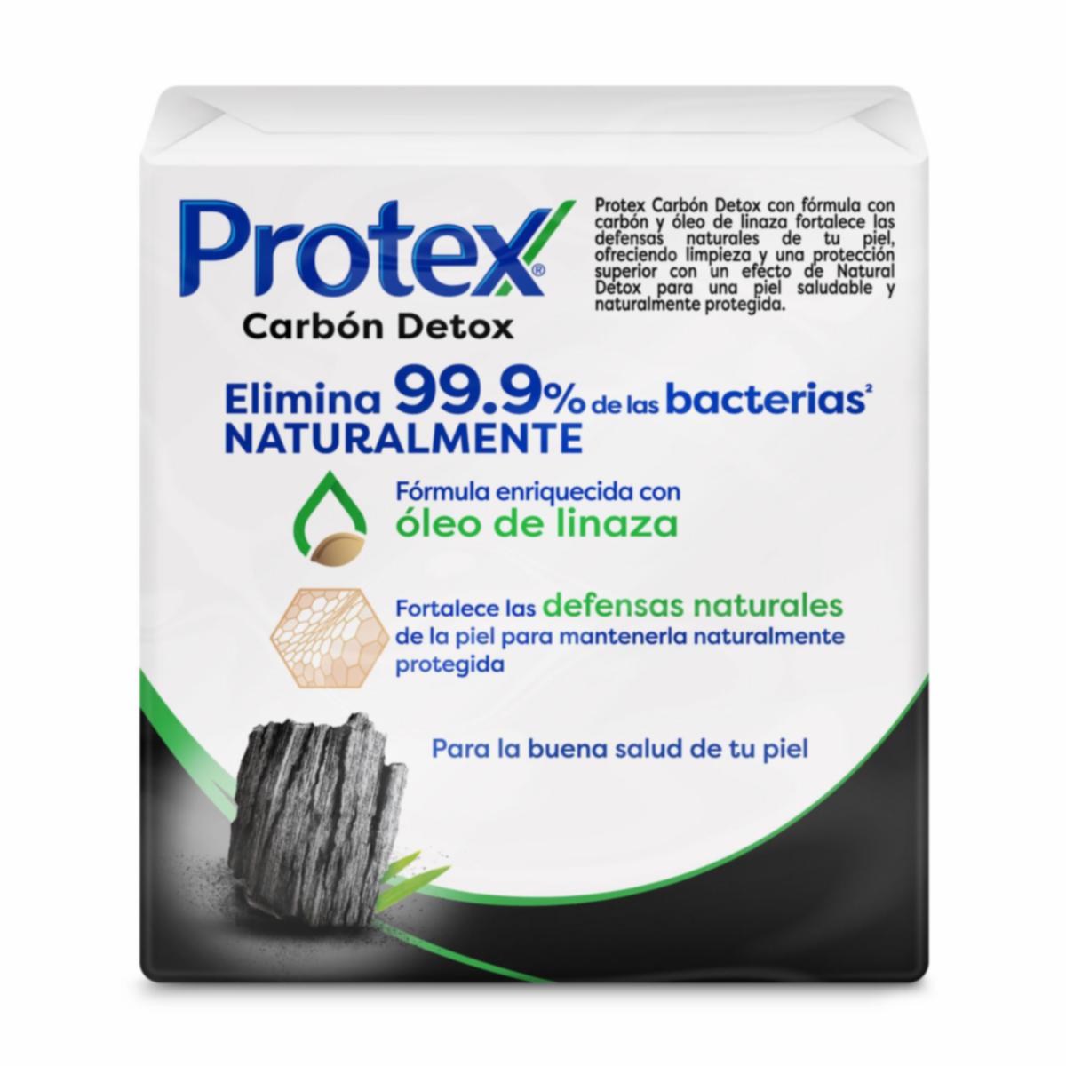 - El jabón Protex Carbón Détox con fórmula con carbón y óleo de linaza fortalece las defensas naturales de tu piel, ofreciendo limpieza y una protección superior con un efecto de Natural Détox para una piel saludable y naturalmente protegida