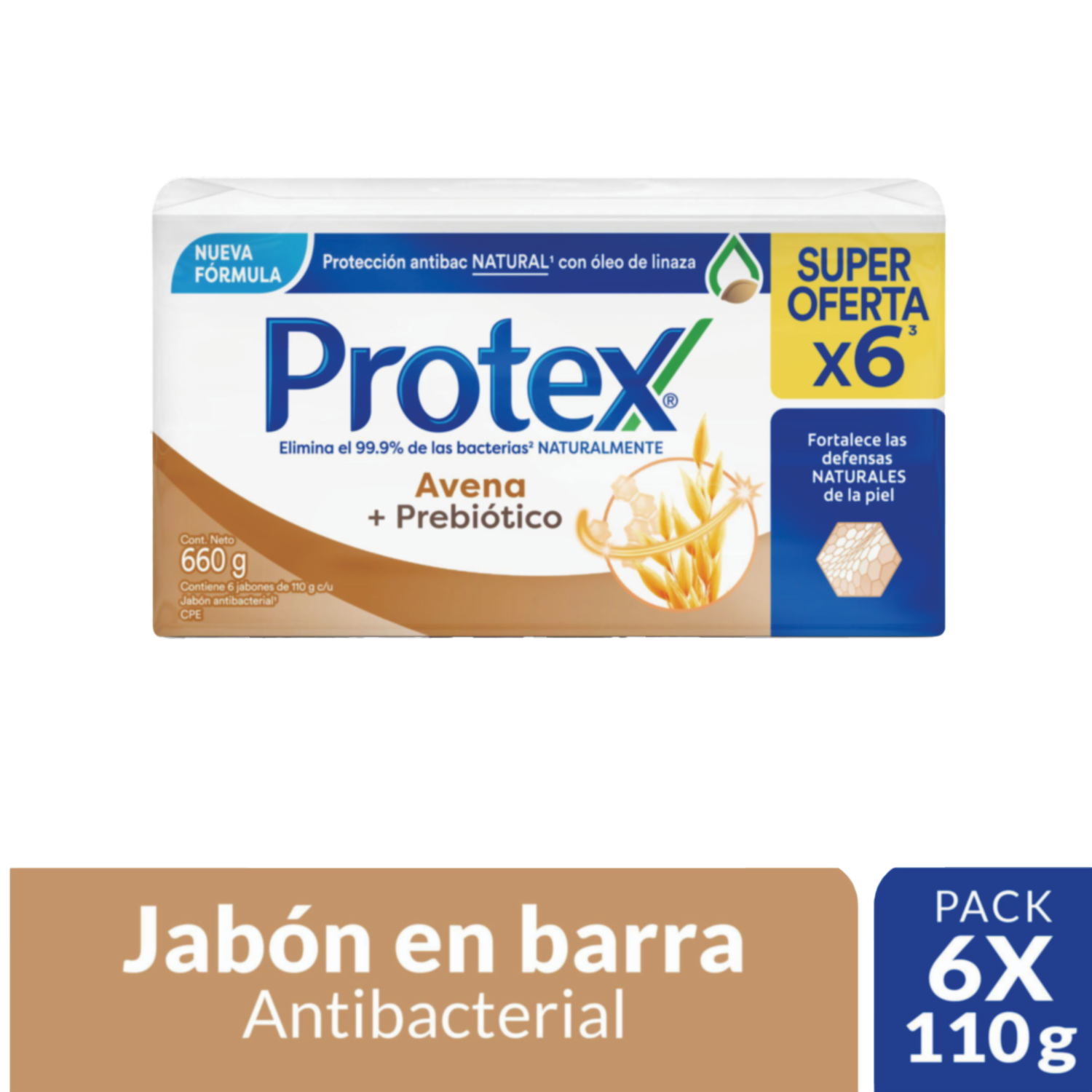 - Consiente tu piel con el Jabón Antibacterial Protex Avena Barra, su presentación con 6 unidades de 110 g. Jabón Protex crea una barrea de protección prolongada, misma que ayuda a prevenir la aparición de bacterias en tu piel