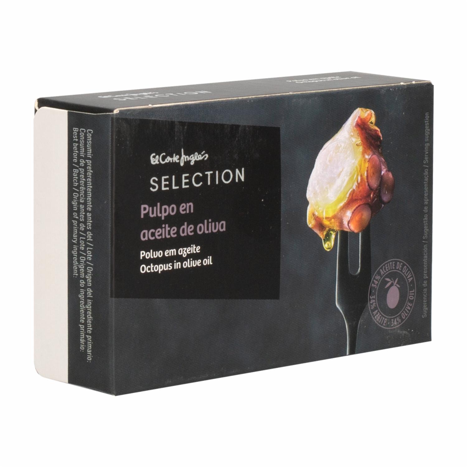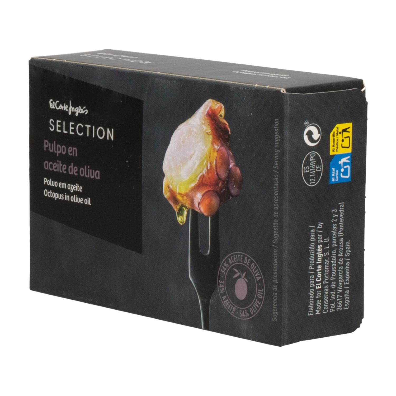 Pulpo en Aceite de Oliva Virgen El Corte Inglés; producto de textura suave con intenso sabor a pulpo y a aceite de oliva virgen. La cocción y preparación del pulpo en conserva se realiza al estilo de las ?pulpeiras? gallegas
