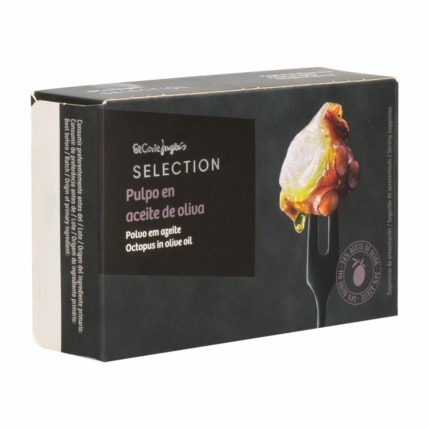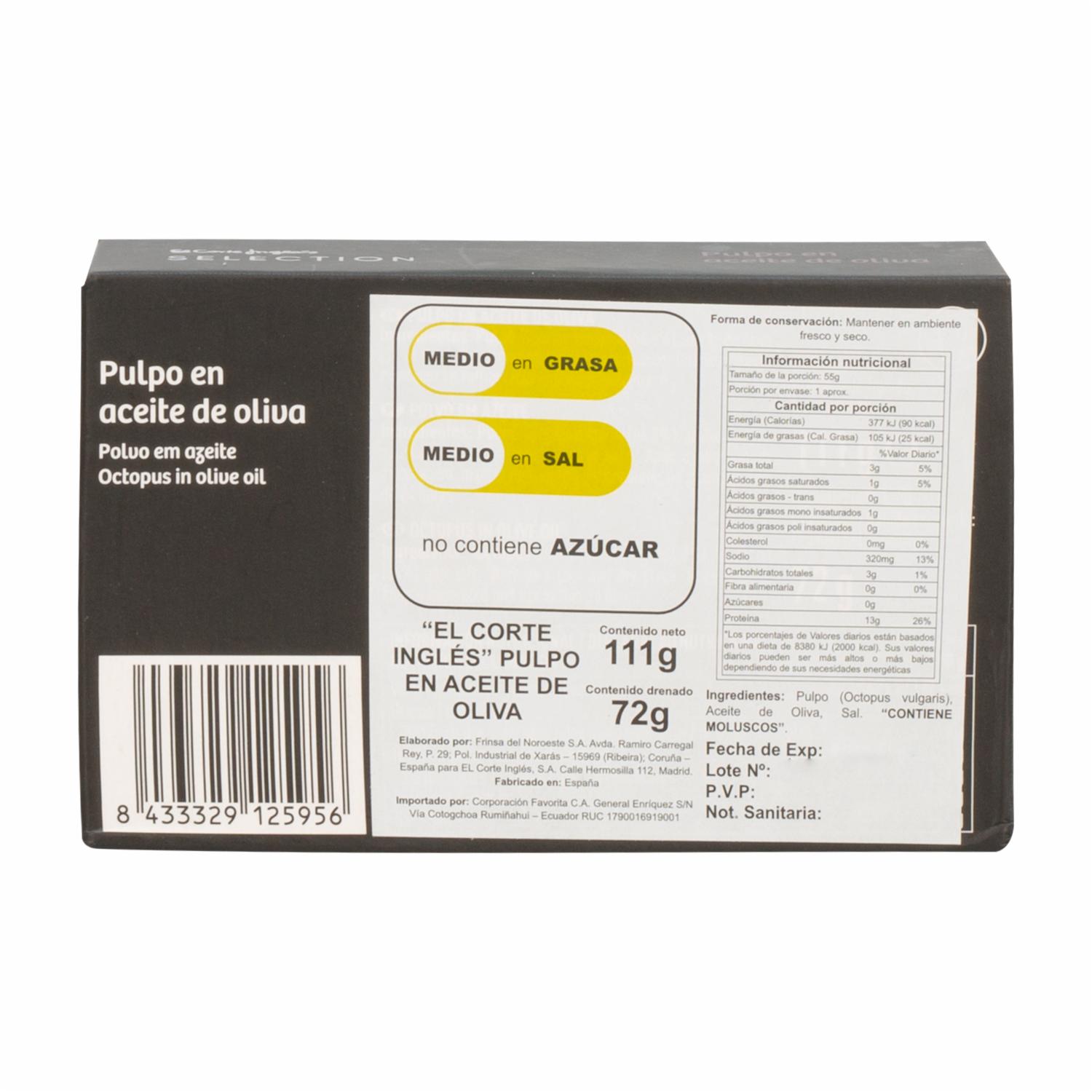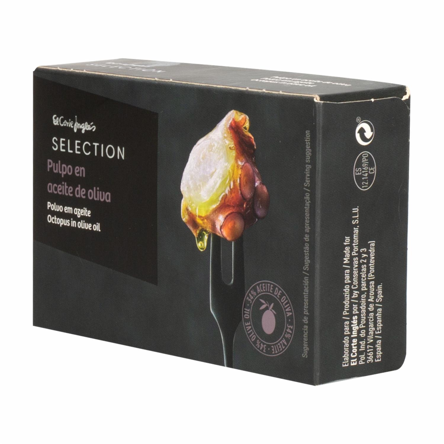 Pulpo en Aceite de Oliva Virgen El Corte Inglés; producto de textura suave con intenso sabor a pulpo y a aceite de oliva virgen. La cocción y preparación del pulpo en conserva se realiza al estilo de las ?pulpeiras? gallegas