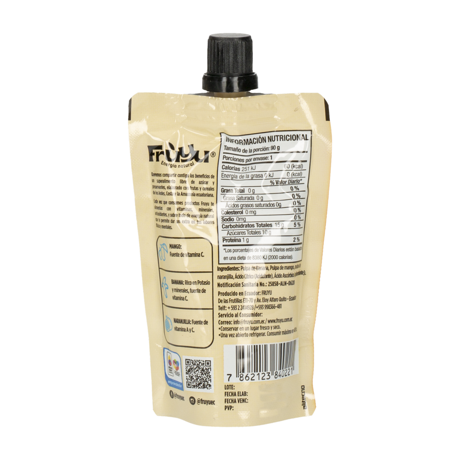 Pure De Mango Banana Y Naranjilla FRÚYU 90 g – FRUYU. Disponible en nuestros locales. Precio y stock pueden variar según la tienda.