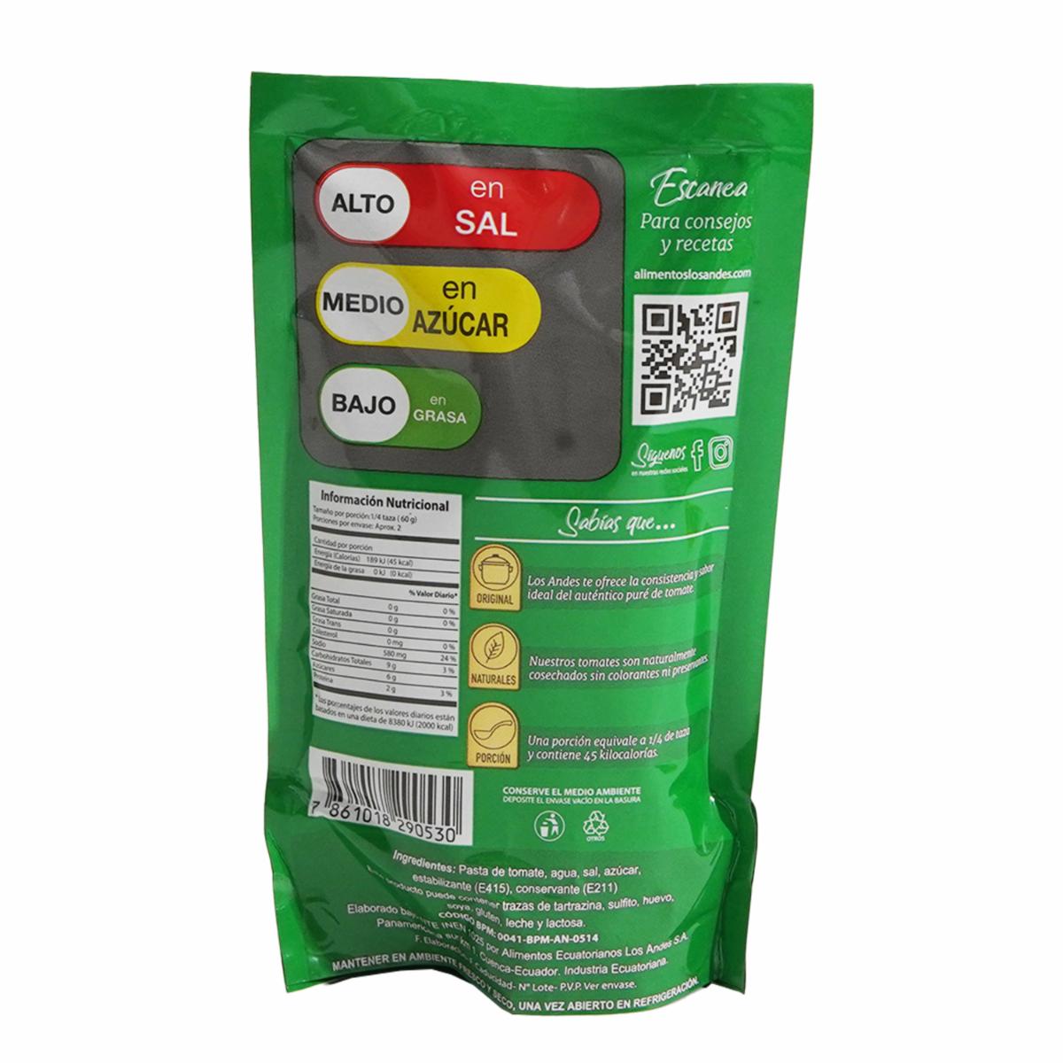 - Experimenta la frescura y autenticidad del Puré de Tomate sin Preservantes de LOS ANDES. Elaborado con tomates seleccionados, este puré ofrece un sabor natural y concentrado, ideal para potenciar tus platillos sin la necesidad de preservantes artificiales