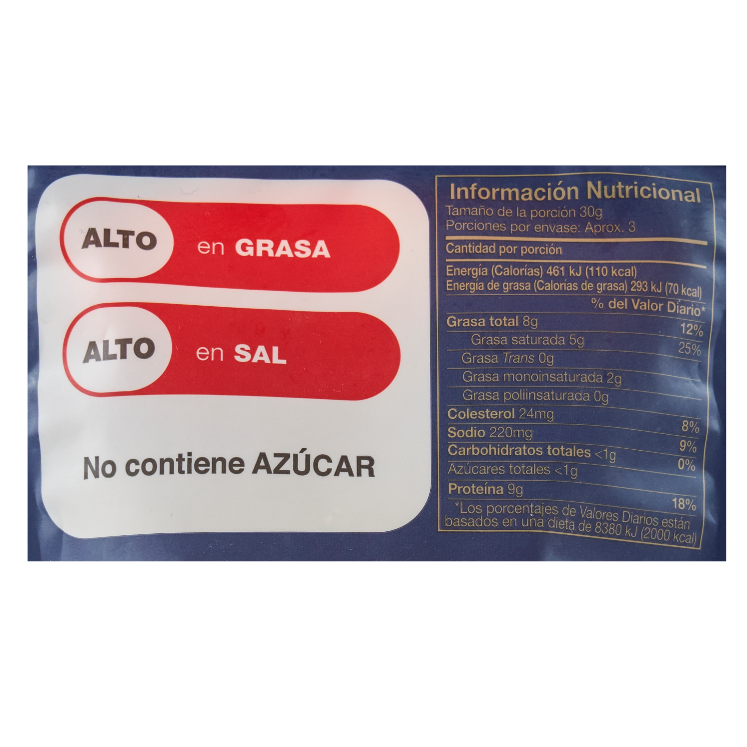 - Queso maduro rallado de sabor intenso y profundo, con una textura granulada y firme que se desmorona fácilmente. Su perfil es salado, con notas a nuez y un ligero toque afrutado, resultado de su larga maduración. Su presentación rallada y con cierre fácil, lo vuelve muy versátil para su uso práctico en cualquier plato