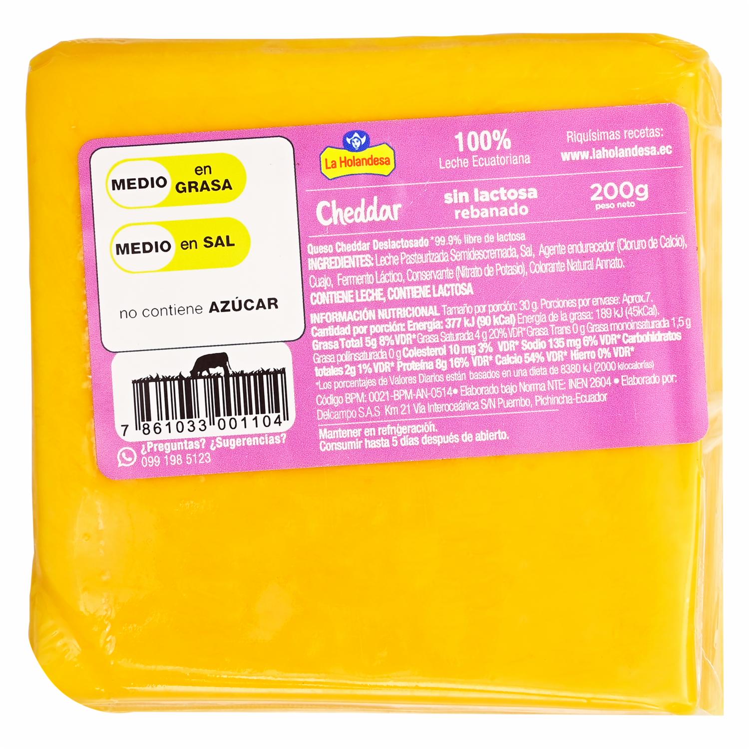 Queso Cheddar Deslactosada Rebanado LA HOLANDESA 200 G