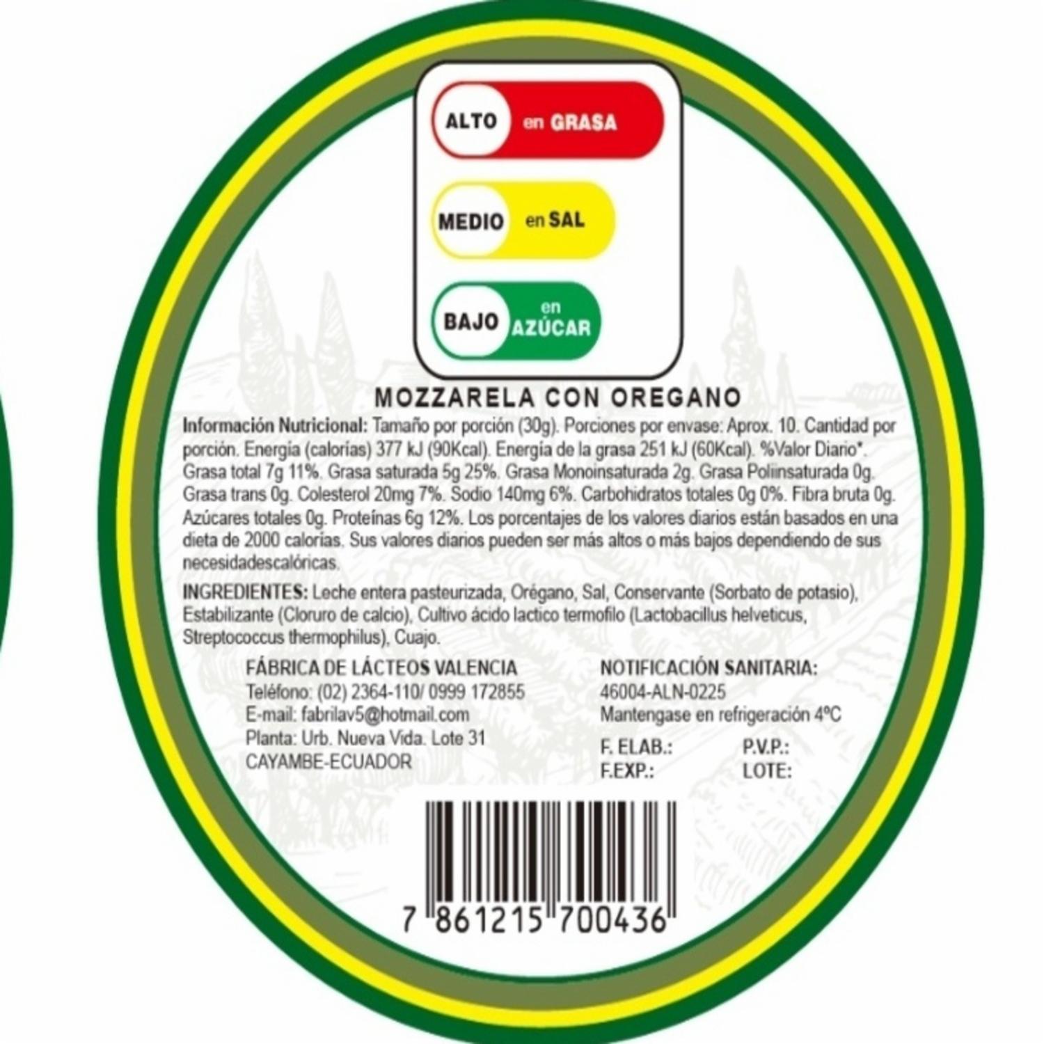 - Queso mozzarella en forma de hoja elaborado con leche de vaca pasteurizada y un toque de orégano deshidratado que aporta un aroma y sabor mediterráneo distintivo. Su textura suave y elástica lo hace ideal para gratinar, rellenar y acompañar ensaladas, sándwiches o pizzas. Es una fuente natural de proteínas y calcio, siendo una opción versátil para el consumo diario o para preparaciones gourmet