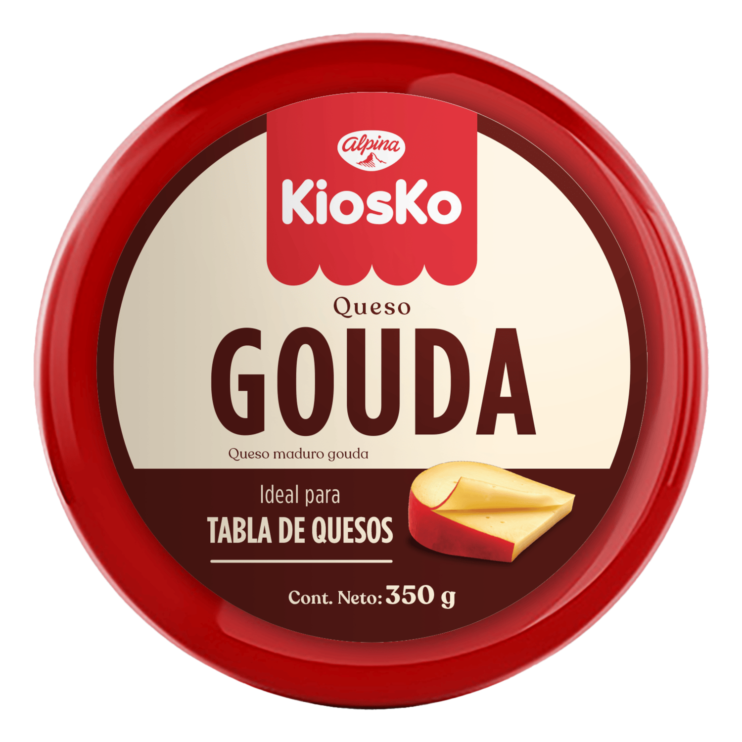 Queso Gouda Kiosko de Alpina: sabor suave y cremoso tras un cuidadoso proceso de maduración. Perfecto con frutos ácidos, dulces y vinos afrutados. Proveniente de Países Bajos, ideal para tablas, recetas gourmet o como snack. Marca preferida en Ecuador por su alta calidad. Transforma tus comidas con Gouda Kiosko