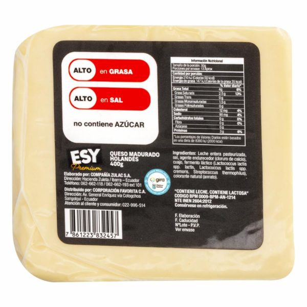 Queso Holandés Premium ESY, de sabor suave y textura cremosa, ideal para sándwiches, gratinados, ensaladas o tablas de quesos. Con 15 días de maduración, ofrece un sabor delicado y versátil que realza cualquier receta. Perfecto para disfrutar solo o acompañado