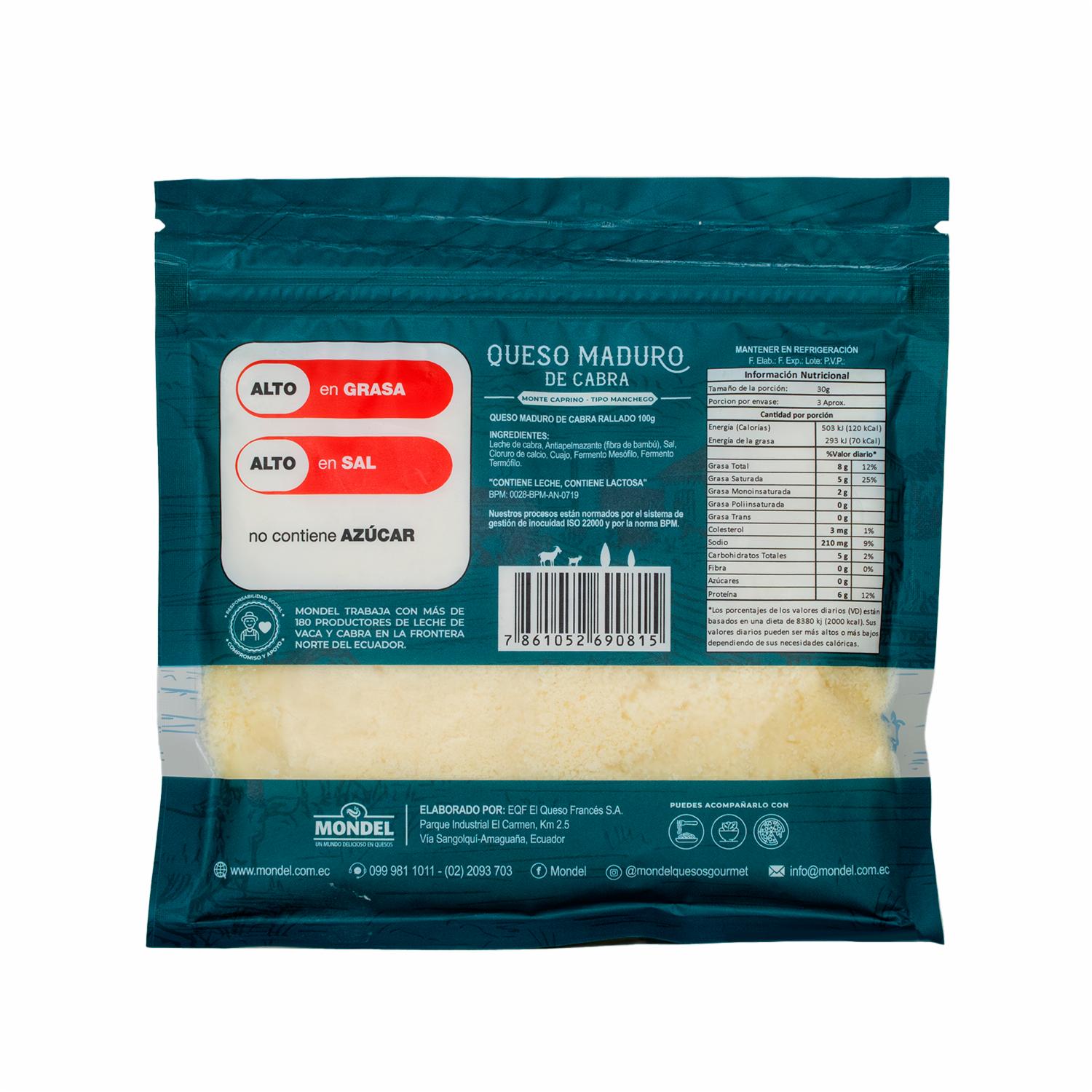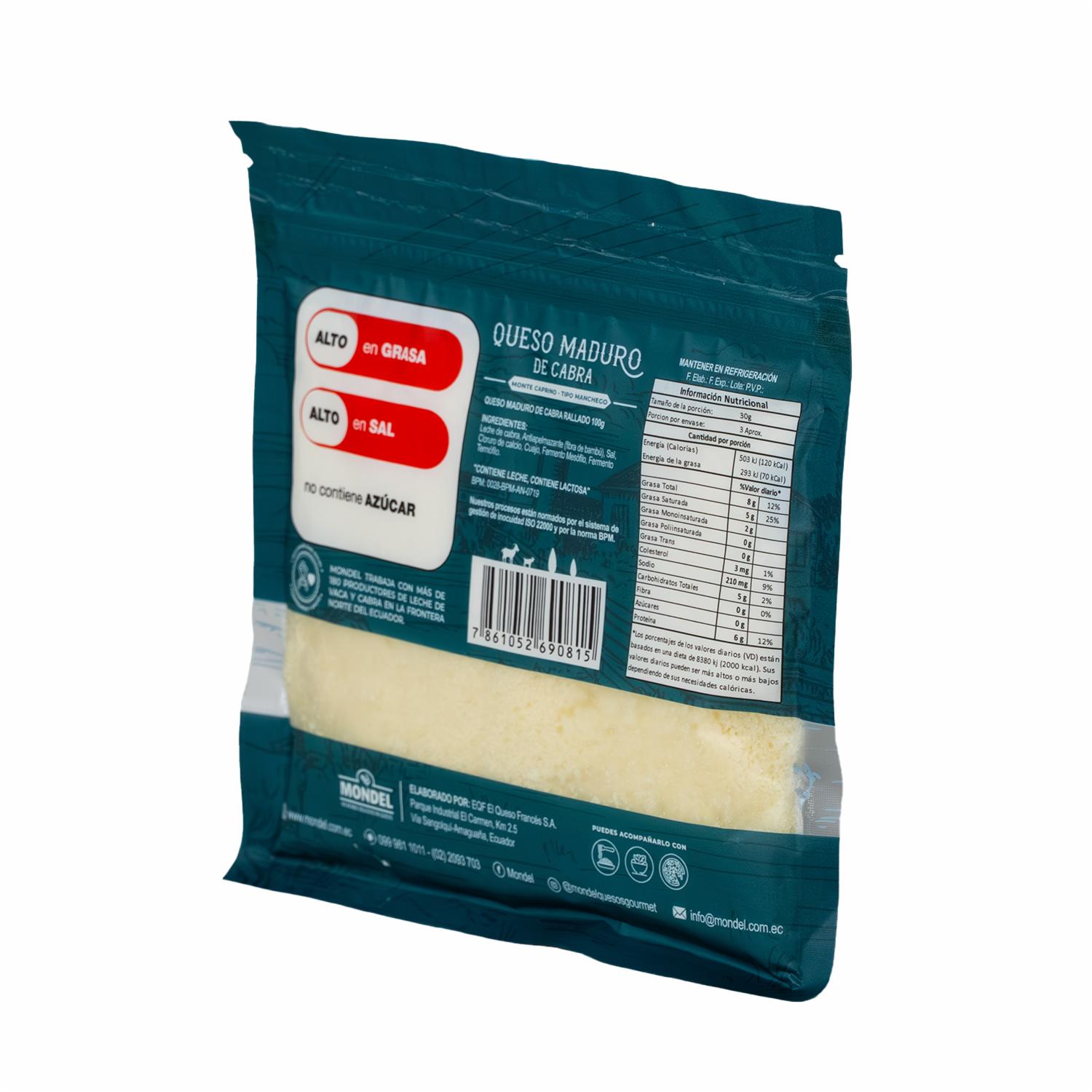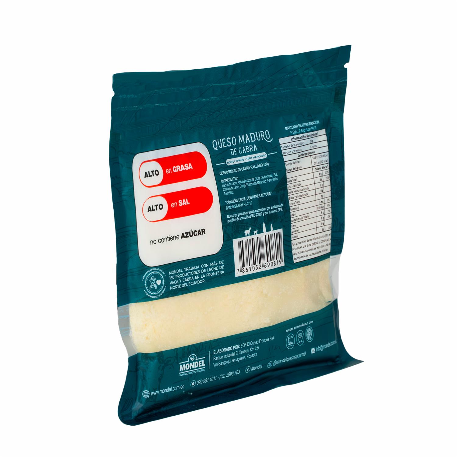 Queso Maduro De Cabra-Monte Caprino-Tipo Manchego Rallado MONDEL 100 G – MONDEL. Disponible en nuestros locales. Precio y stock pueden variar según la tienda.