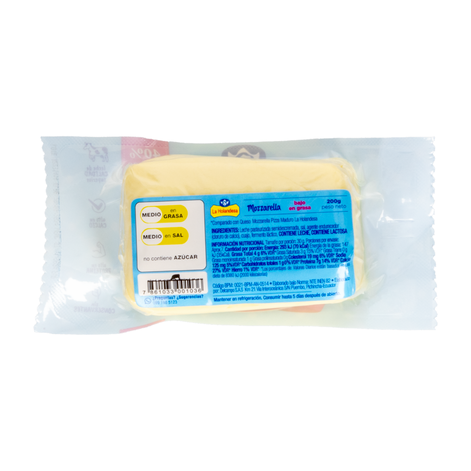 - Su textura suave y sabor agradable es ideal para fundir en pizzas, pastas, lasañas, tacos, milanesas, Su elasticidad al derretirlo es característico, La ventaja de los quesos mozzarellas de LA HOLANDESA es su bajo volumen de humedad, No posee suero y al momento de cocinarlo no desprende suero que da un mal sabor a las comidas