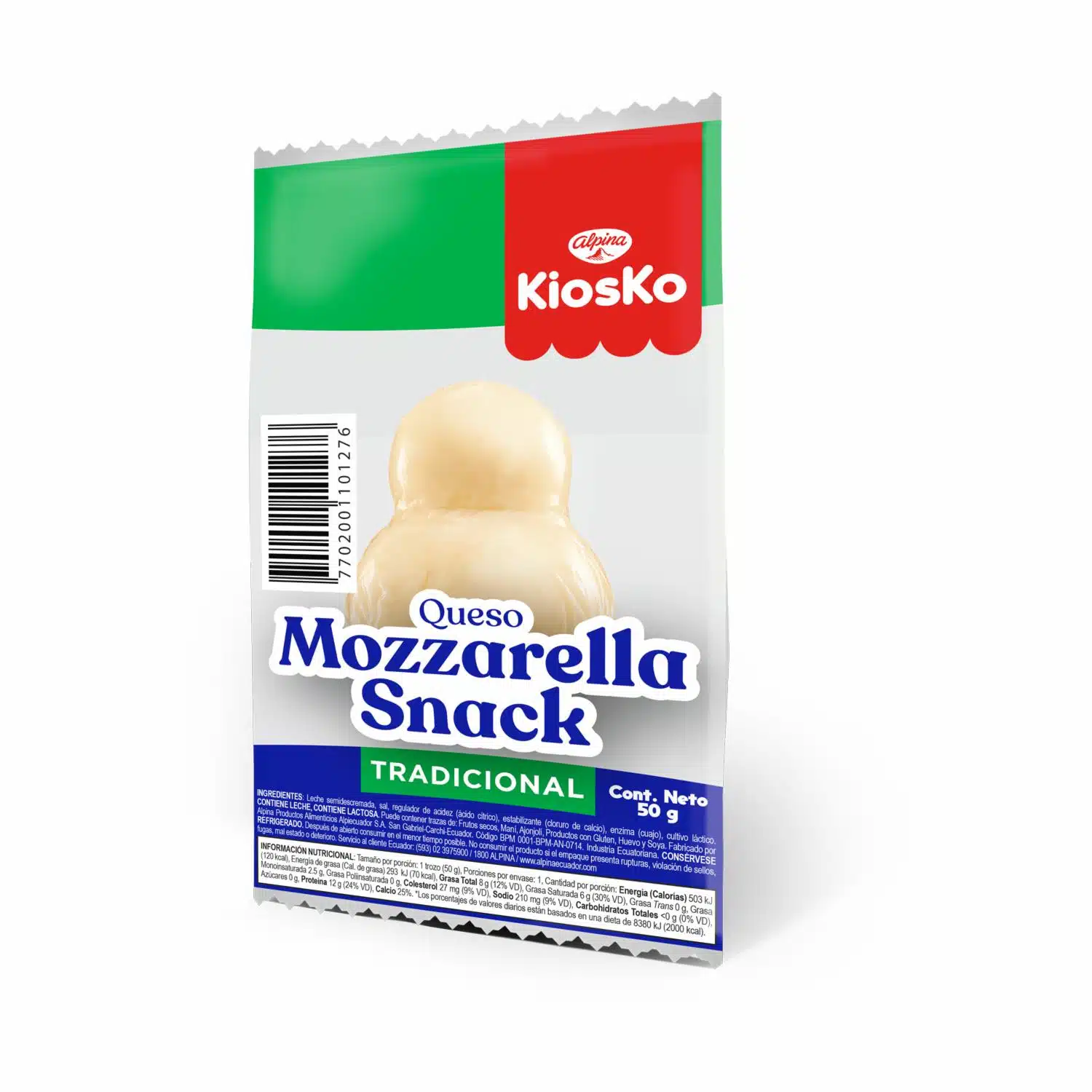 Queso Mozzarella Kiosko de Alpina: elaborado con leche fresca, textura suave y cremosa. Ideal para loncheras y snacks
