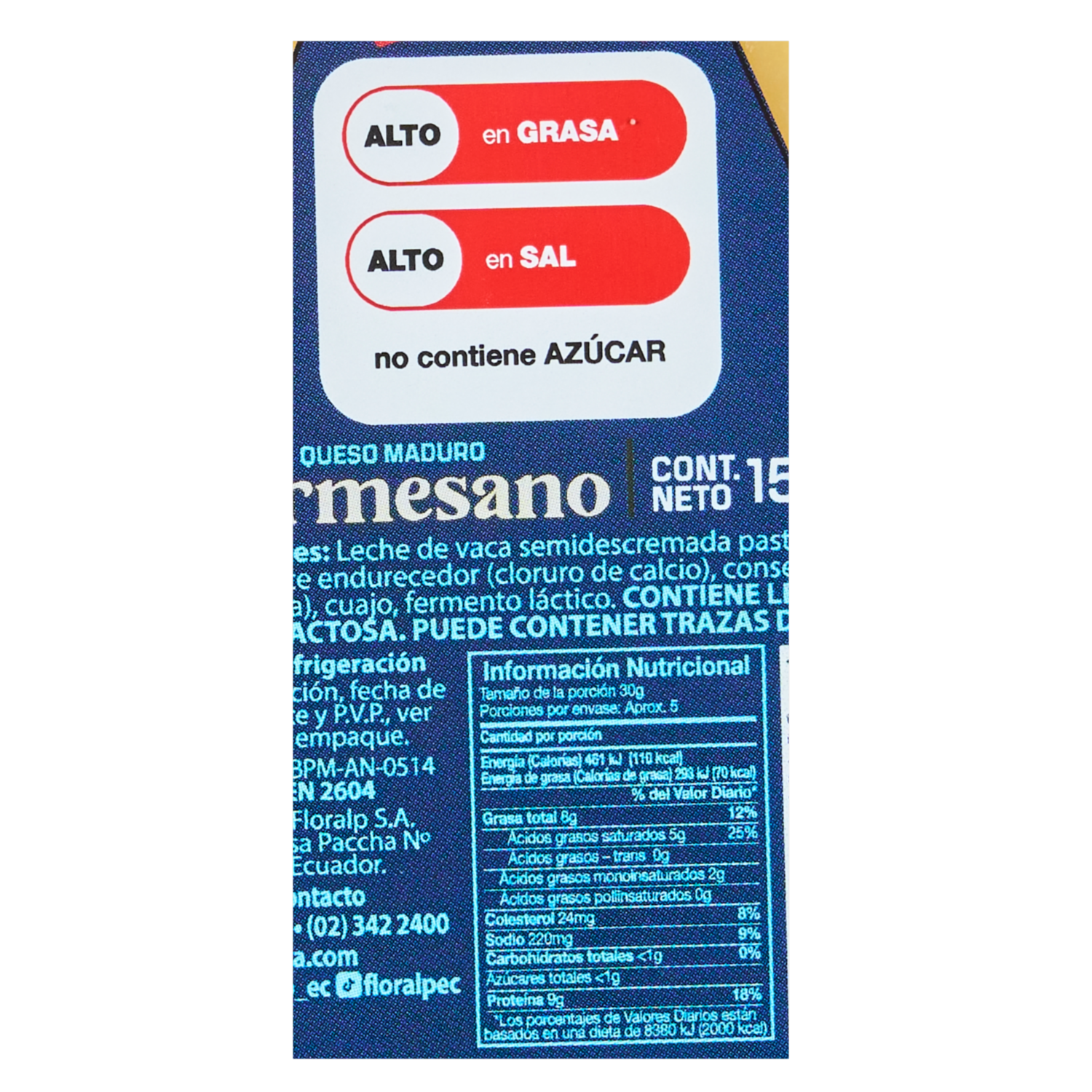 Queso Parmesano Cuña FLORALP 150 G – FLORALP. Disponible en nuestros locales. Precio y stock pueden variar según la tienda.