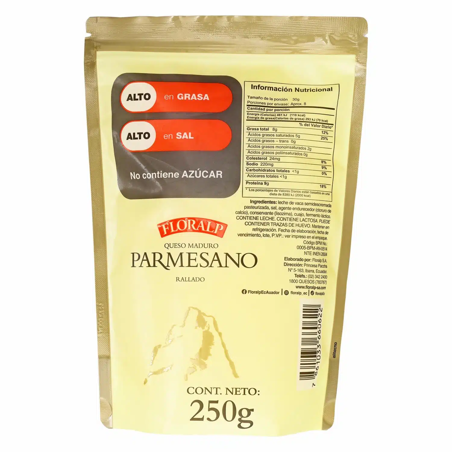 Queso parmesano rallado Floralp, ideal para acompañar pastas o bocaditos , conserve en refrigeración de preferencia