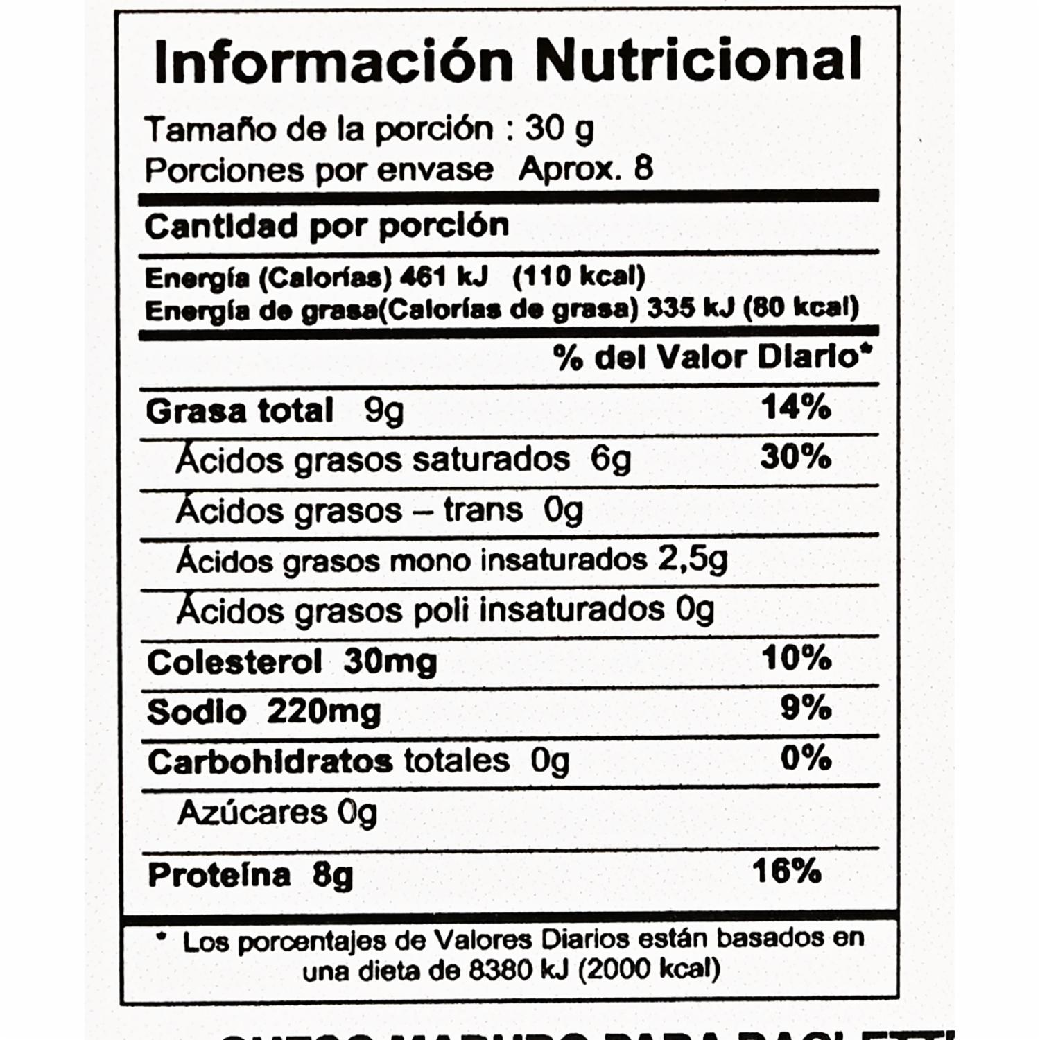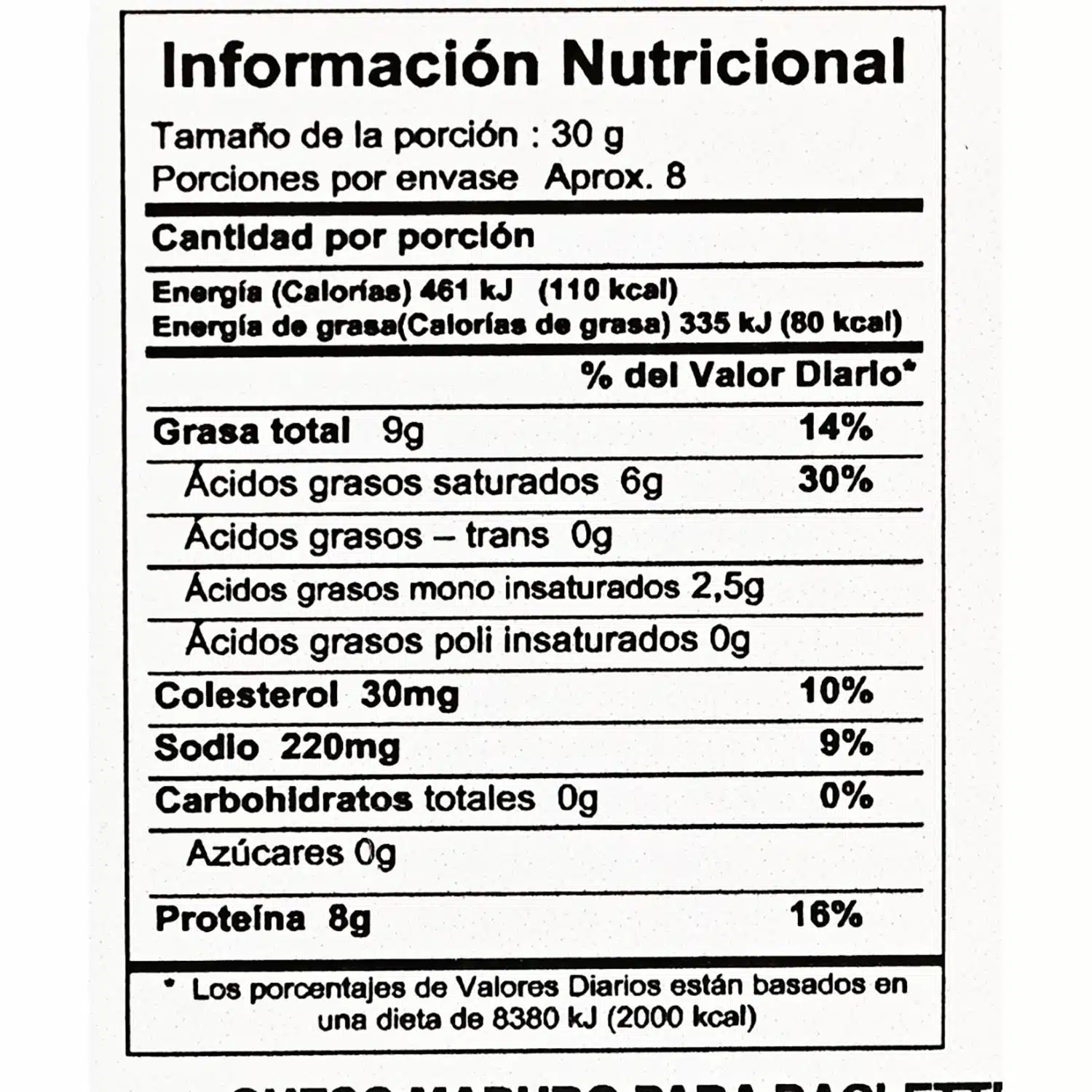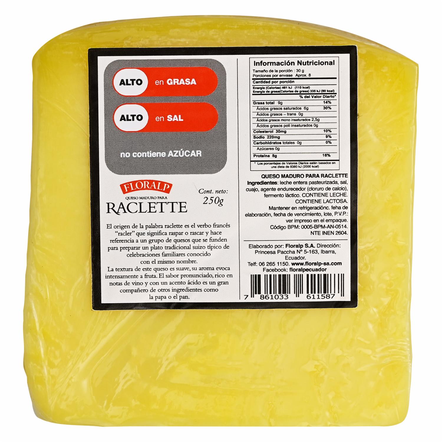 Queso semiduro de textura suave y cremosa. - Elaborado con leche de vaca pasteurizada. - Sabor ligeramente dulce y ahumado. - Ideal para fundir y gratinar en raclette o para preparar sándwiches y pizzas. - Producido por Cuna FLORALP, una empresa suiza con más de 50 años de experiencia en la elaboración de quesos de alta calidad