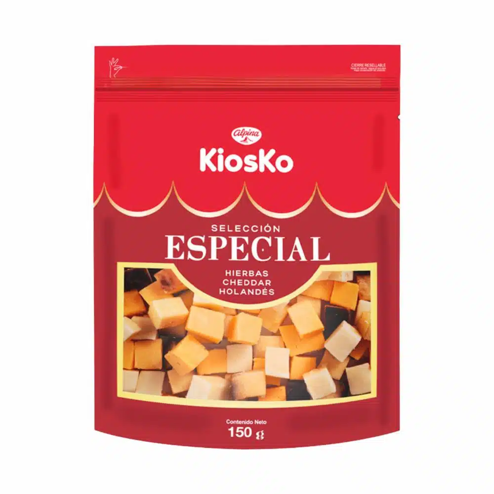 Selección Especial Kiosko 150 g, combinación de quesos semimaduros: cheddar suave y cremoso, holandés ácido equilibrado y queso con hierbas fresco y aromático. Con ingredientes naturales, sin conservantes, rico en proteínas y calcio. Perfecto para picoteo. Añádelo a tu carrito y disfruta su sabor irresistible
