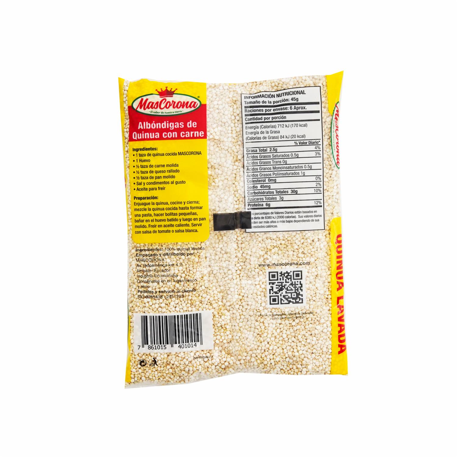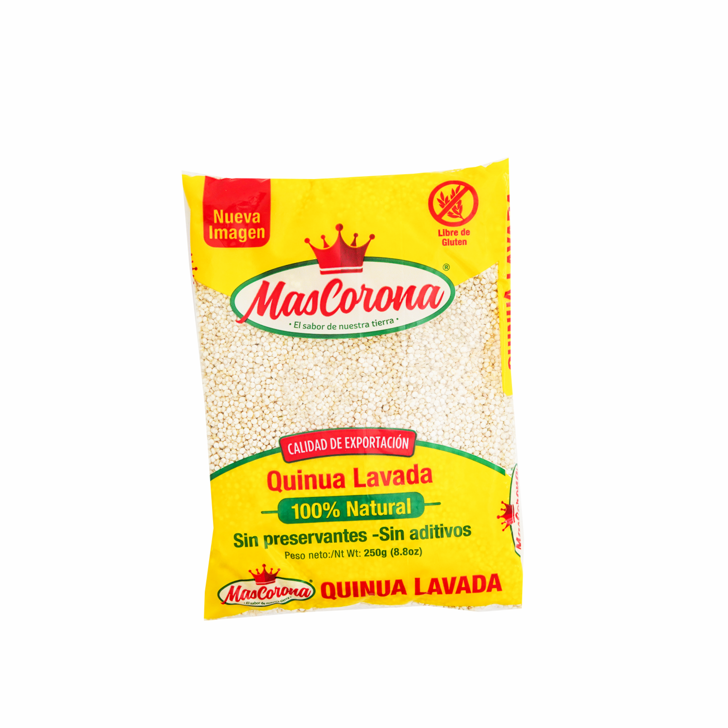 - La Quinua Lavada Natural MASCORONA, en su presentación de 250 g, es un producto versátil y nutritivo que se ha vuelto muy popular en la cocina debido a sus numerosos beneficios para la salud y su versatilidad culinaria