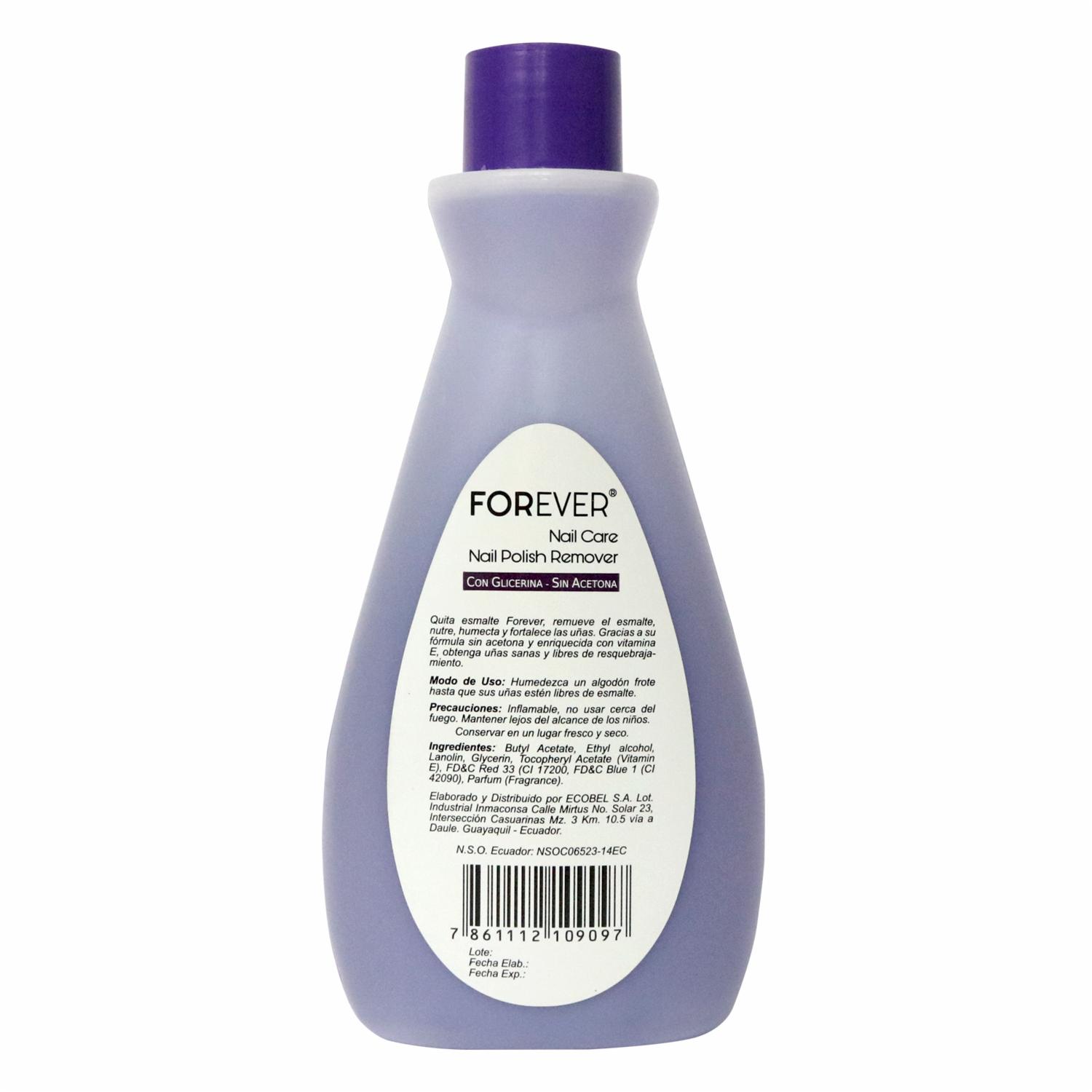 - Forever Quitaesmalte con glicerina elimina eficazmente el esmalte sin resecar uñas ni cutículas