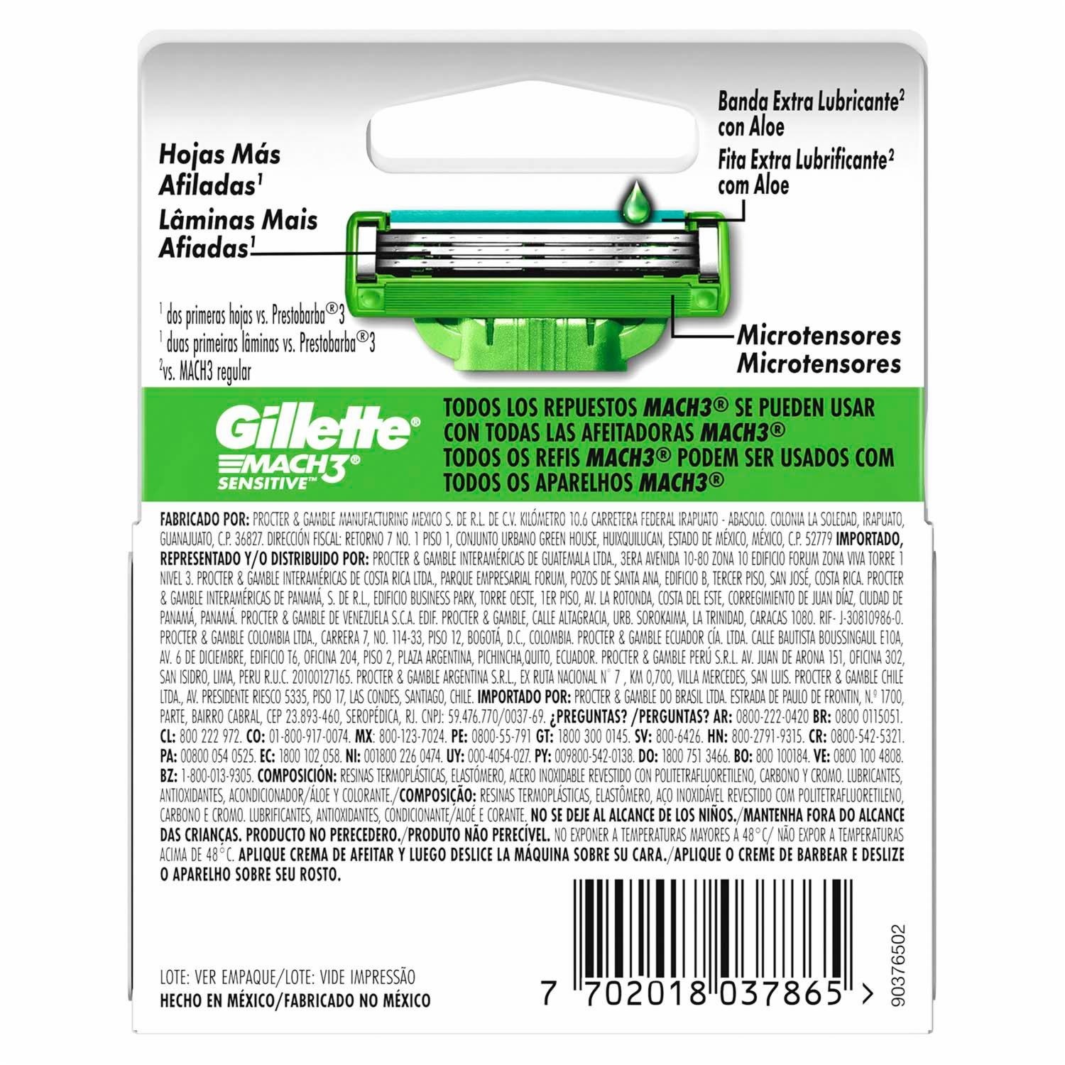 - Los repuestos para la máquina de afeitar gillette mach3 sensitive, ideales para hombres con piel sensible, te dan una afeitada al ras y con menos irritación el cartucho mach 3 sensitive cuenta con una banda lubricante con aloe y vitamina e y 3 hojas más fuertes que el acero que se mantienen afiladas por más tiempo* (*vs prestobarba3)