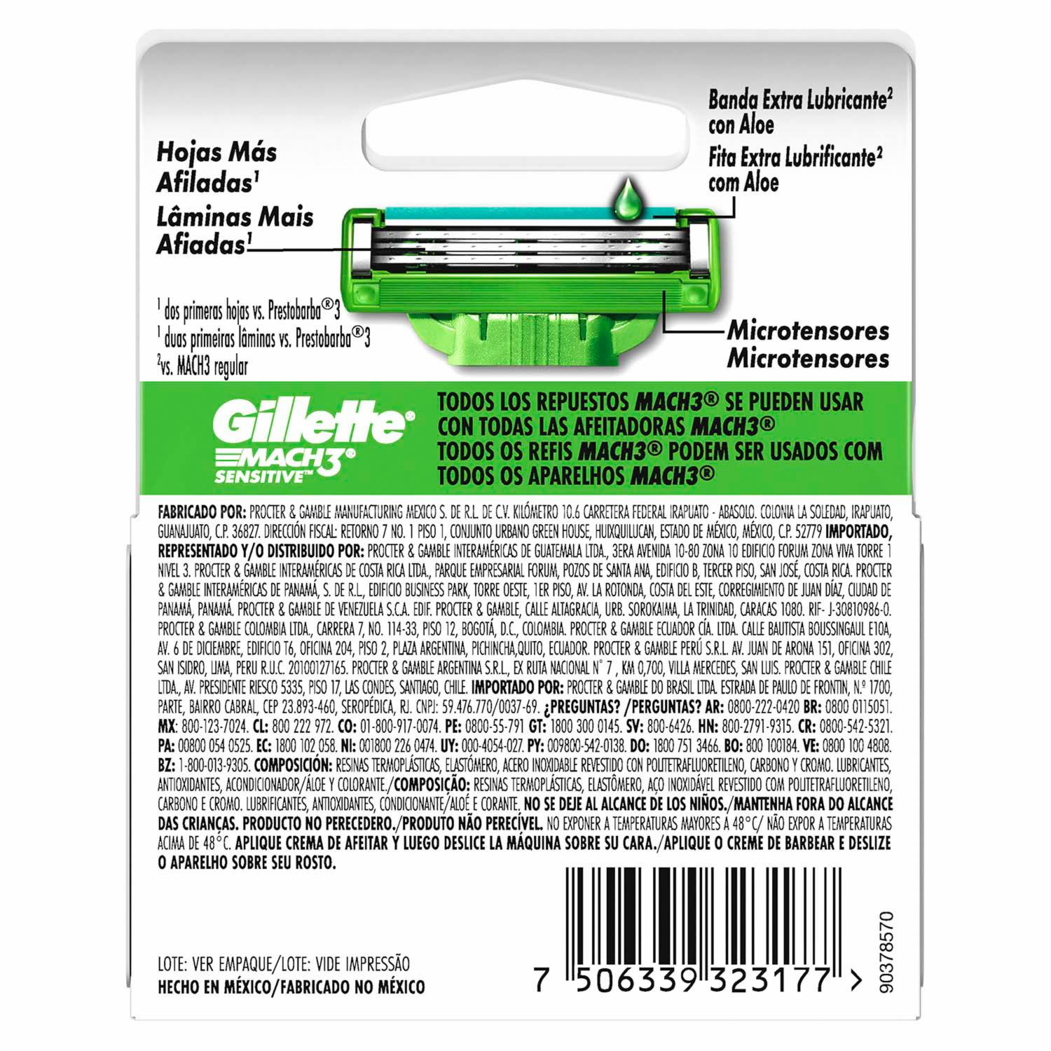 - El cartucho mach 3 sensitive cuenta con una banda lubricante con aloe y vitamina e y 3 hojas más fuertes que el acero que se mantienen afiladas por más tiempo* (*vs prestobarba3) cuenta con una cabeza flexible que se ajusta al contorno de tu cara y 10 microtensores que alisan la piel para protegiendola en cada pasada