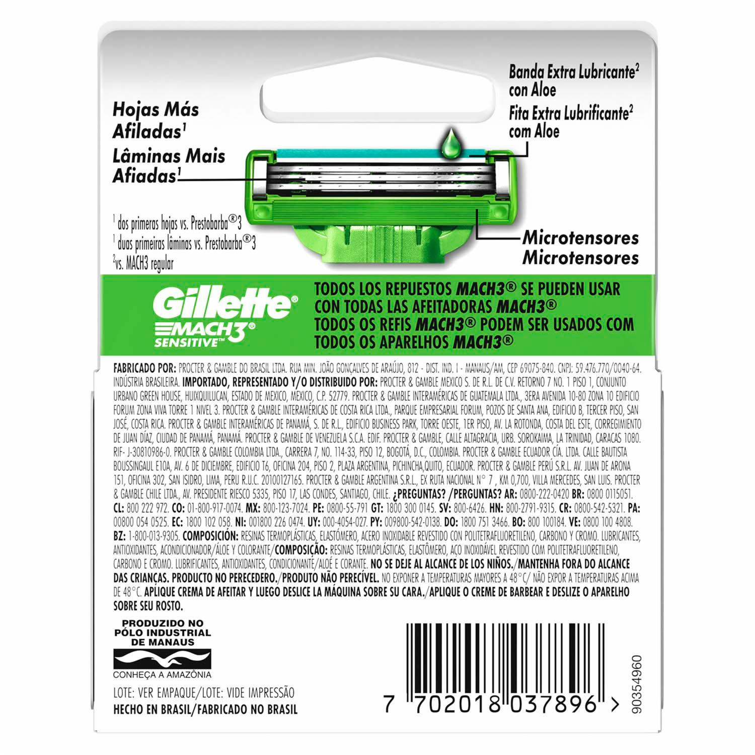 - Los repuestos para la máquina de afeitar gillette mach3 sensitive, ideales para hombres con piel sensible, te dan una afeitada al ras y con menos irritación el cartucho mach 3 sensitive cuenta con una banda lubricante con aloe y vitamina e y 3 hojas más fuertes que el acero que se mantienen afiladas por más tiempo* (*vs prestobarba3)