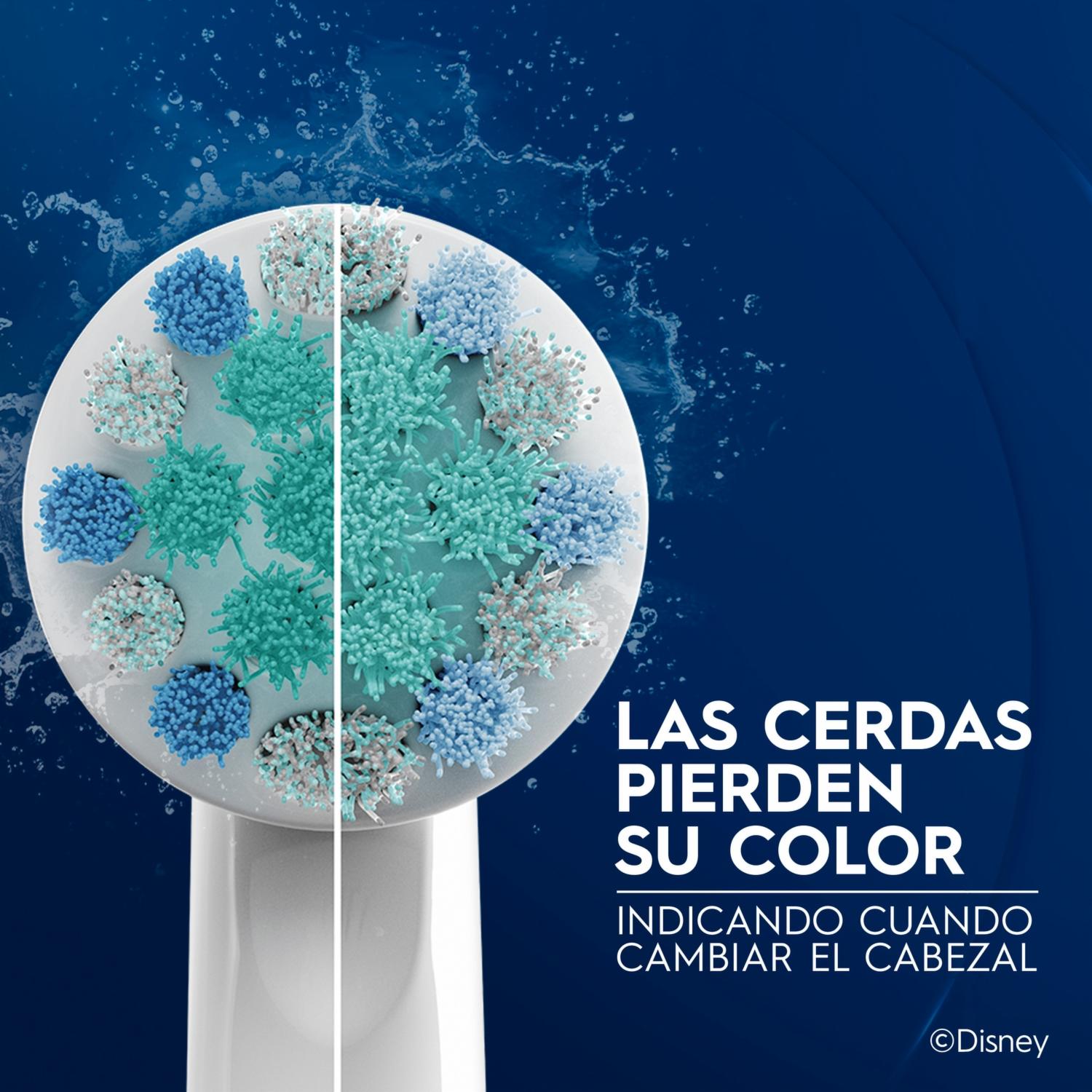 • Este cabezal remueve más placa que un cepillo tradicional y fue creado para que tus hijos empiecen a desarrollar buenos hábitos de higiene oral al lavar sus dientes. Usa un nuevo repuesto cada vez que las cerdas se pongan amarillas y pierdan la firmeza