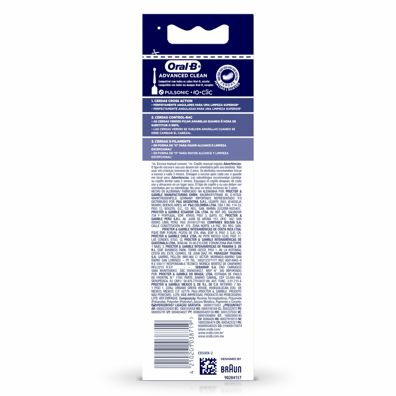 El cabezal de repuesto Advanced Clean para cepillo eléctrico Oral-B, es compatible con todos los cepillos excepto la Serie iO, además es apto para usuarios con ortodoncia. Gracias a su cabezal redondo puedes disfrutar una limpieza superior en cada cepillado, sus cerdas rodean cada diente para remover hasta 100% más placa que un cepillo manual tradicional. Recuerda cambiar de cabezal cuando los filamentos verdes y azules pierdan su color, así podrás asegurar un cepillado y limpieza eficiente