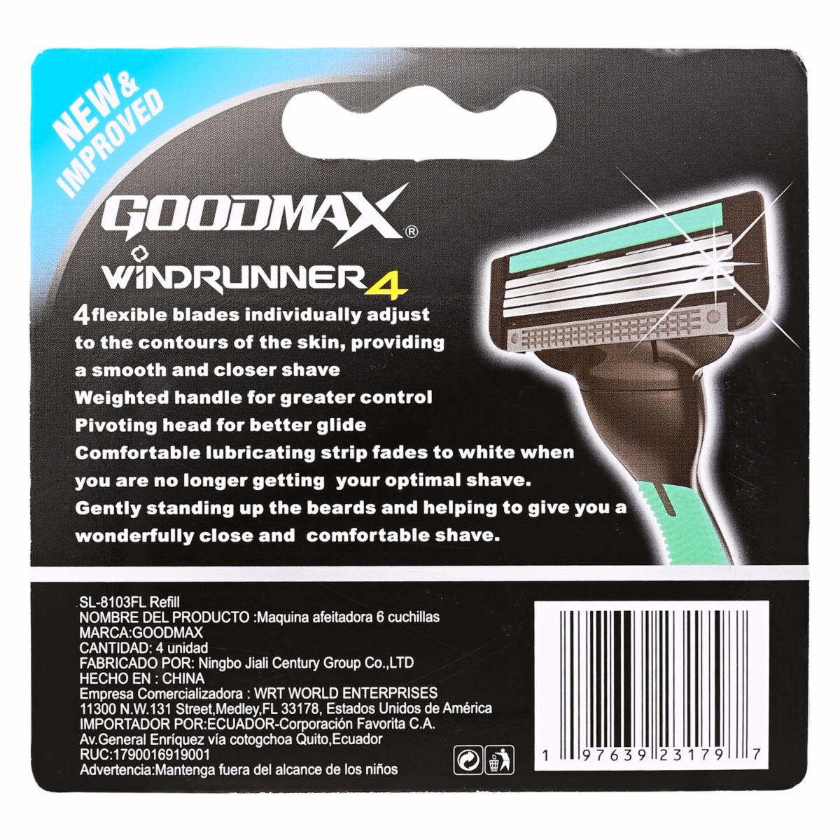 Repuestos De Afeitadora Windrunner 4 GOODMAX 4 Piezas – GOODMAX. Disponible en nuestros locales. Precio y stock pueden variar según la tienda.