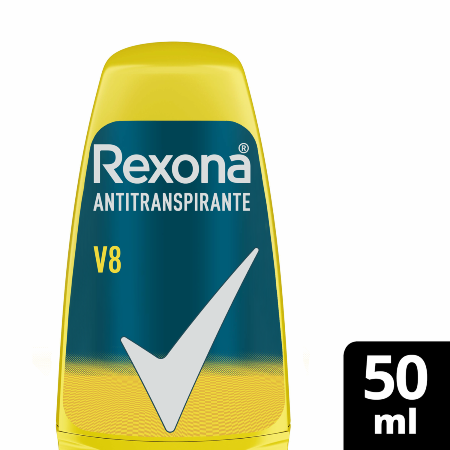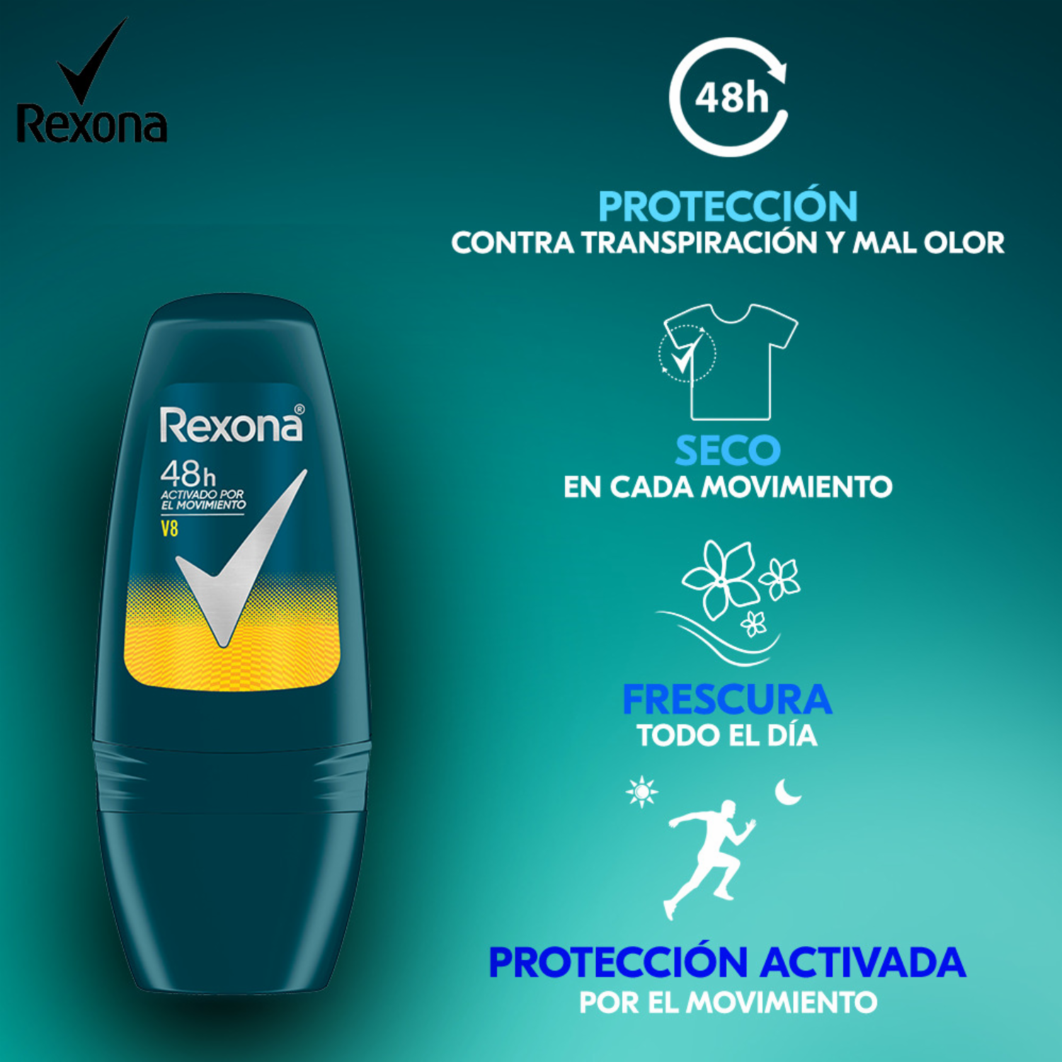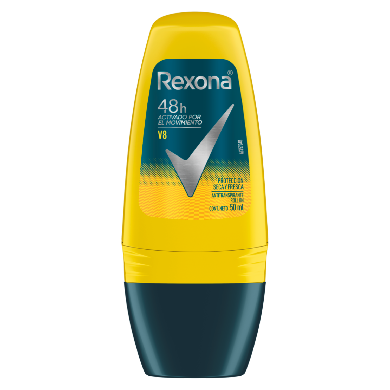 - Experimenta una protección potente y antibacterial con el Desodorante Roll-On V8 Antibacterial de Rexona en su envase de 50ml