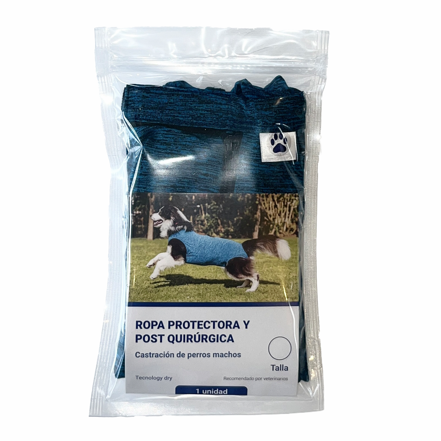 Uso animal. Despues de la cirugía de castración o hernia perineal en perro macho. Evita lamer o morder zonas delicadas, brindando una mayor protección y comodidad durante su proceso de recuperación, de acuerdo con la orientación veterinaria. Secado rápido y capacidad de adaptarse a la anatomía de la mascota gracias a la composición del producto
